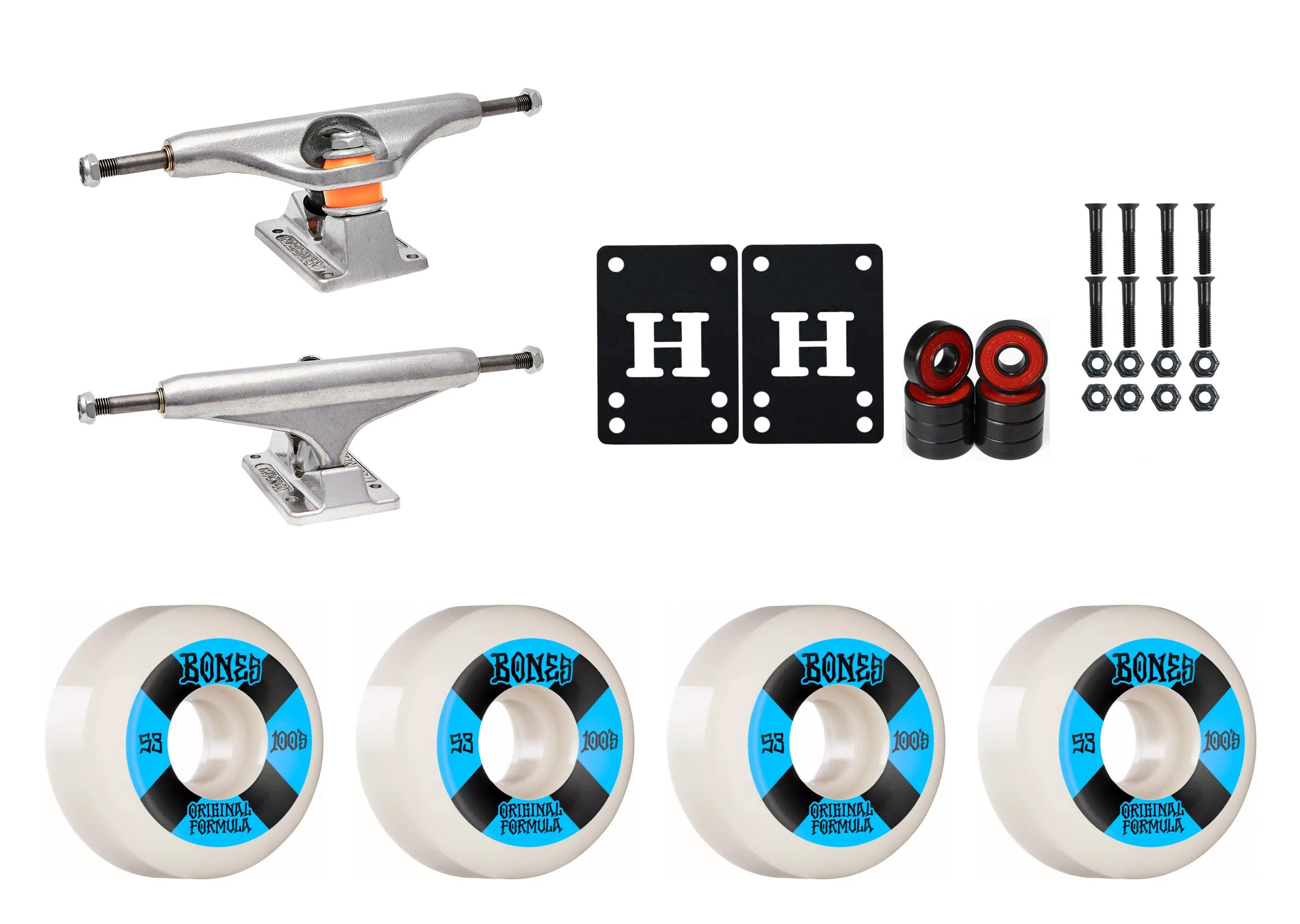 This package contains everything you need to make your deck a complete. Includes a set of Independent Mid Trucks, Bones 100's Wheels, Amp Abec 5 Bearings, 1" Hardware, and 1/8" Riser pads. Just add a deck and griptape and you are ready to ride! Indy trucks are a durable, high performance truck for all types of skateboarding. 356 T6 Aluminum hanger and baseplate, solid Chromoly steel axle, grade 8 kingpin, Indy cushions with cylinder bottom. Featuring superior turn and stability, better grind clearance, improved no hang-up yoke for grind tricks, and less wheel bite. They last longer and are stronger on impact than any other truck on the market. These Bones wheels feature the V5 Sidecut shape, poured with the original 100A formula. These Wheels Measure 53mm x 31mm. High rebound, high abrasion resistance, high performance, smooth roll. Indy 159's Measure 8.75" wide.