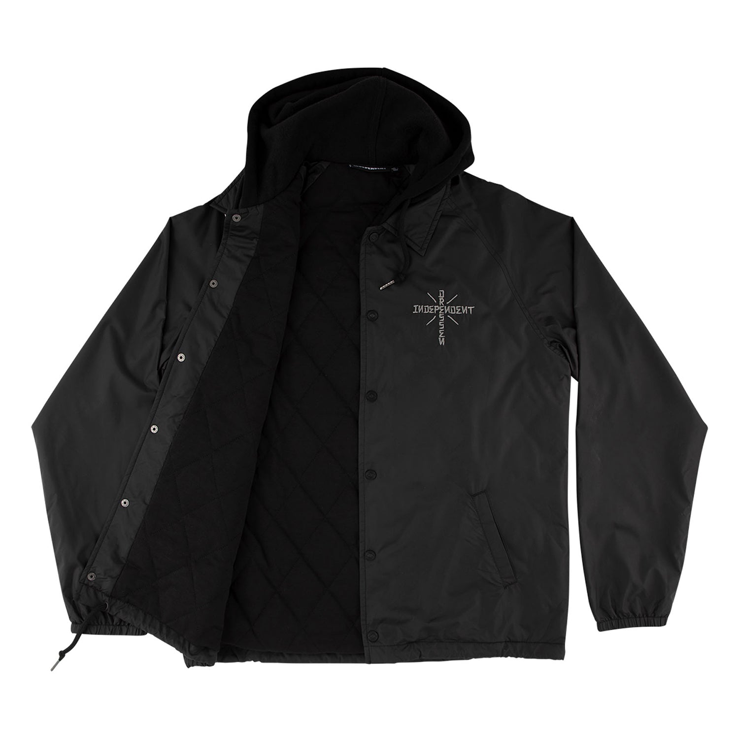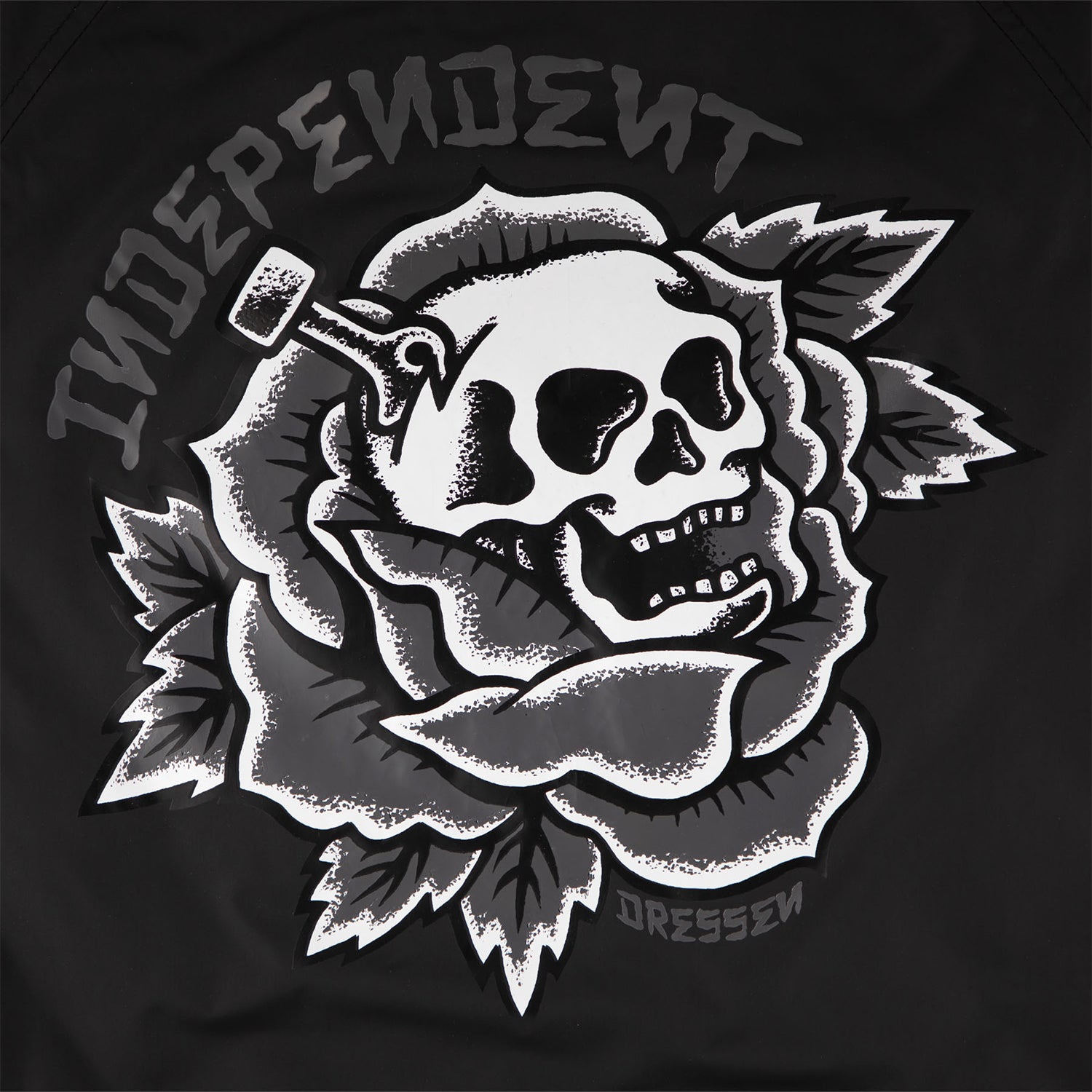 The Independent Dressen Skull Rose regular fit, hooded windbreaker jacket features large back print, front hood cord adjustment with plastic tips, fleece hood, bottom hem cord adjustment, light interior fill with diamond quilt jersey lining, small front Independent embroidery, 2 welt hand pockets, elastic cuffs, and front metal snap closure. Artwork by Eric Dressen.