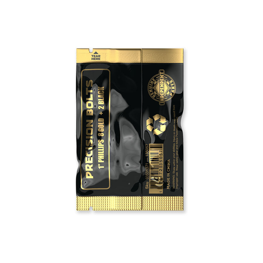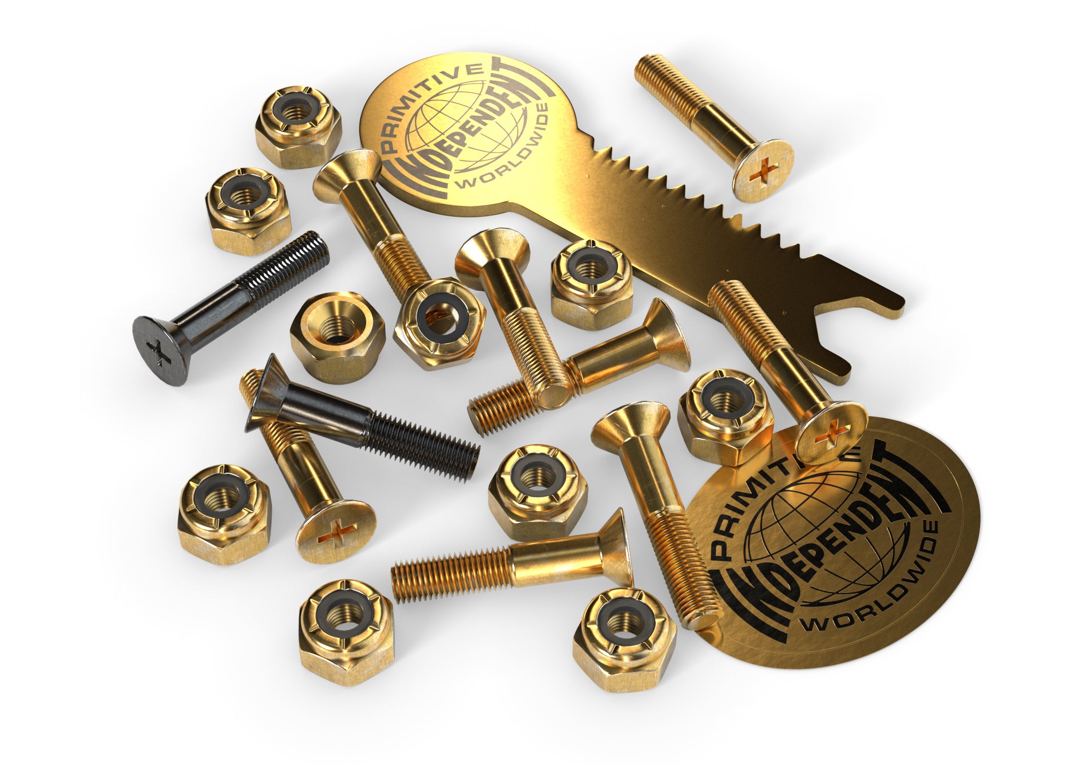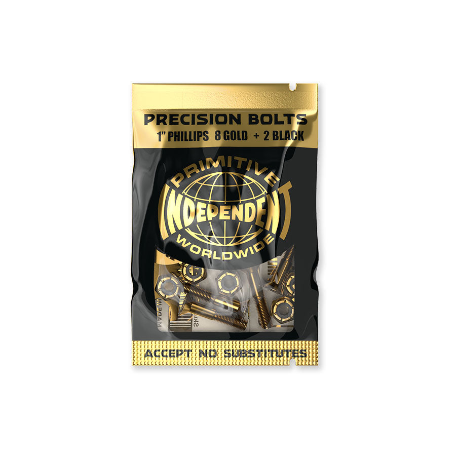 Independent X Primitive Genuine Parts 1 inch Phillips Hardware featuring 8 gold and 2 black bolts, gold with black nylon locking nuts, a gold Independent X Primitive steel tool, and gold foil decal.