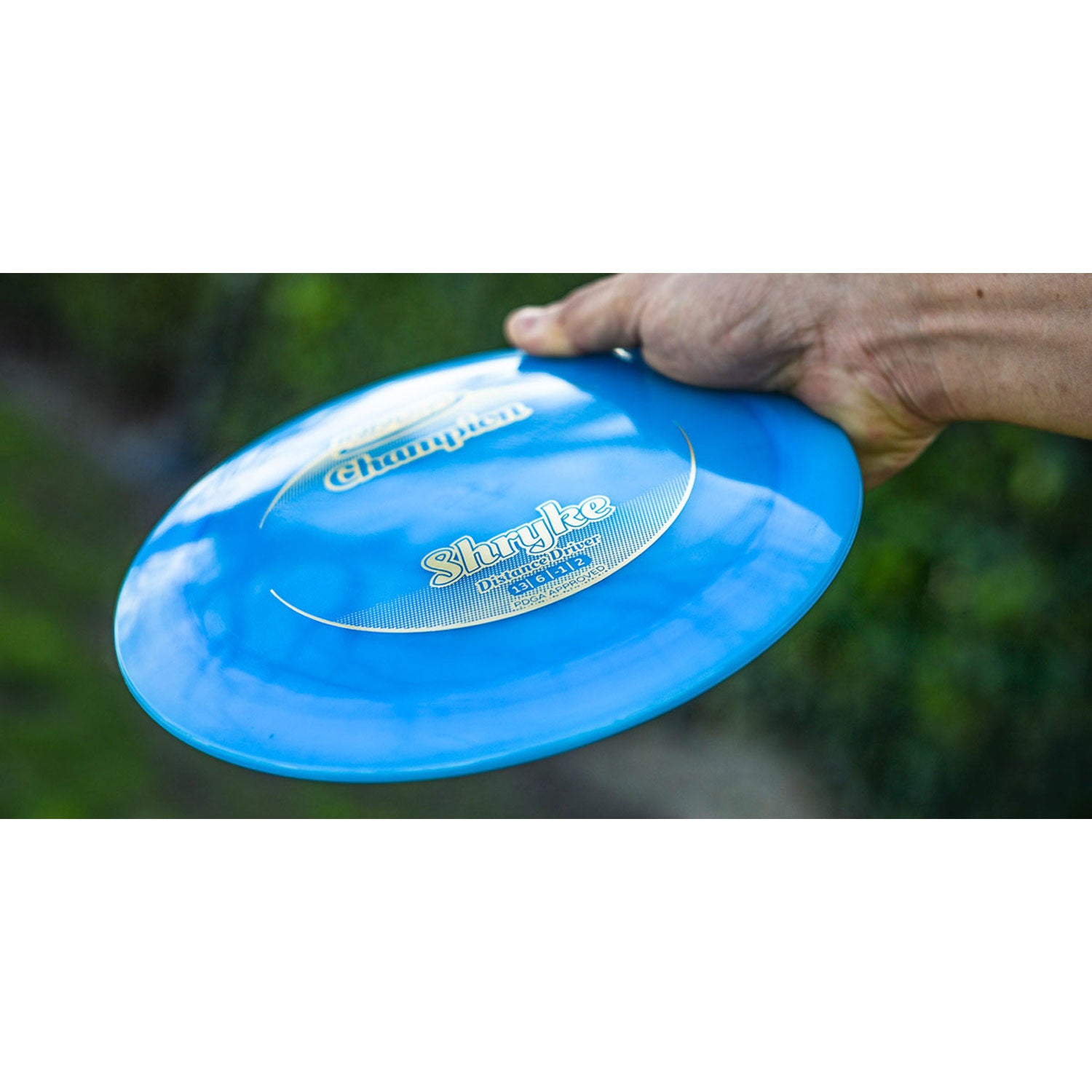 The Shryke is a high speed, max glide distance driver that's perfect for pinning down targets. The Champion line is produced with a hi-tech plastic that provides outstanding performance and durability. Champion discs are distinguished by a beautiful clear appearance. Designed for professional players, Champion line discs are usually a little firmer and more stable than the same model in other plastics. Whether used in heavily wooded situations, or on extremely rugged courses, our Champion line plastic will continue to perform predictably and avoid damage better than any other plastic.