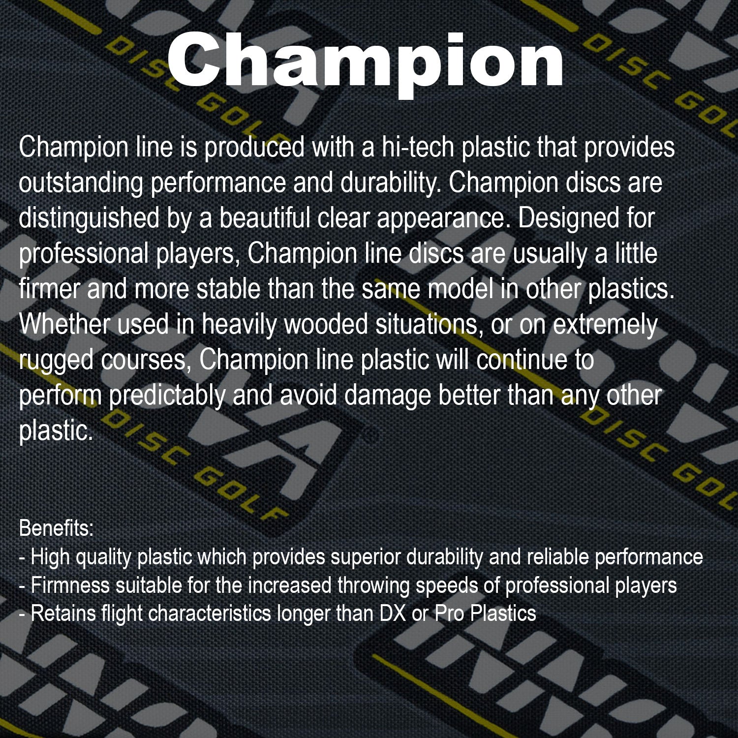 The Destroyer is a fast, stable power driver with significant glide. A great disc for sidearm throwers and those with lots of power. The Champion line is produced with a hi-tech plastic that provides outstanding performance and durability. Champion discs are distinguished by a beautiful clear appearance. Designed for professional players, Champion line discs are usually a little firmer and more stable than the same model in other plastics. Whether used in heavily wooded situations, or on extremely rugged courses, our Champion line plastic will continue to perform predictably and avoid damage better than any other plastic.