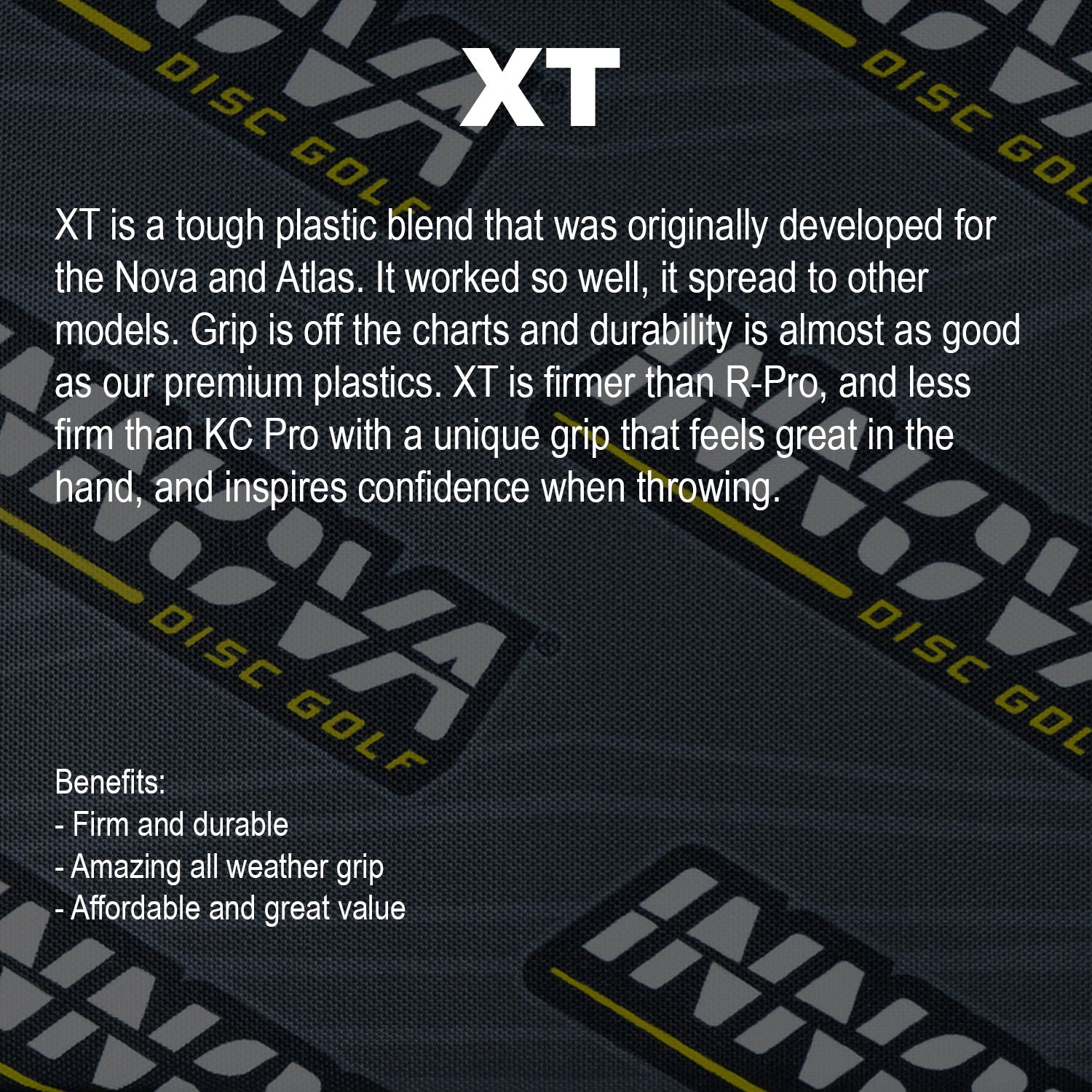 XT is a tough plastic blend that was originally developed for the Nova and Atlas. It worked so well, it spread to other models. Grip is off the charts and durability is almost as good as our premium plastics. XT is firmer than R-Pro, and less firm than KC Pro with a unique grip that feels great in the hand, and inspires confidence when throwing.