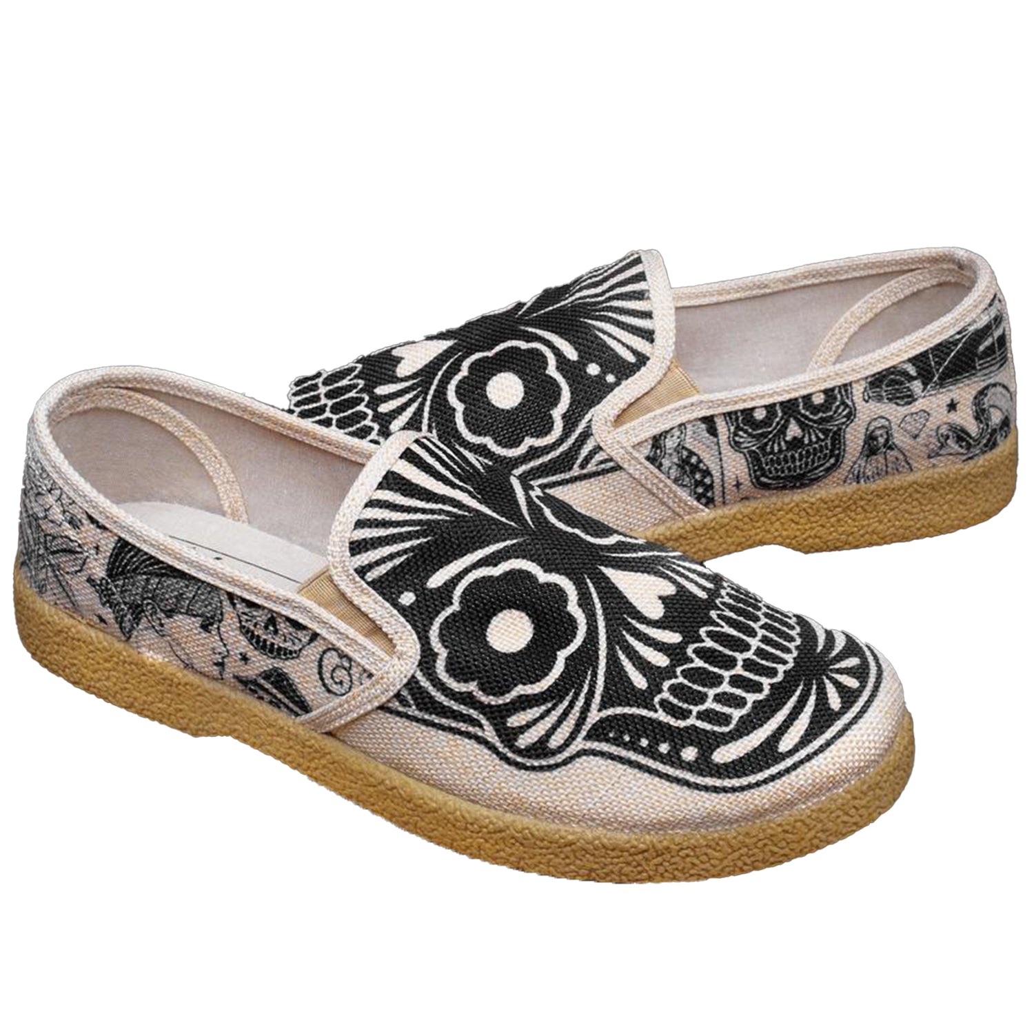 Mike Giant Edition Wino Slip On. Printed with custom artwork by Mike Giant. Timeless design with high quality ivory burlap upper. Heel panel for added stability. Durable, lightweight outsole with traction pattern. Premium constructed insole provides comfort and support. 100% vegan friendly shoes.