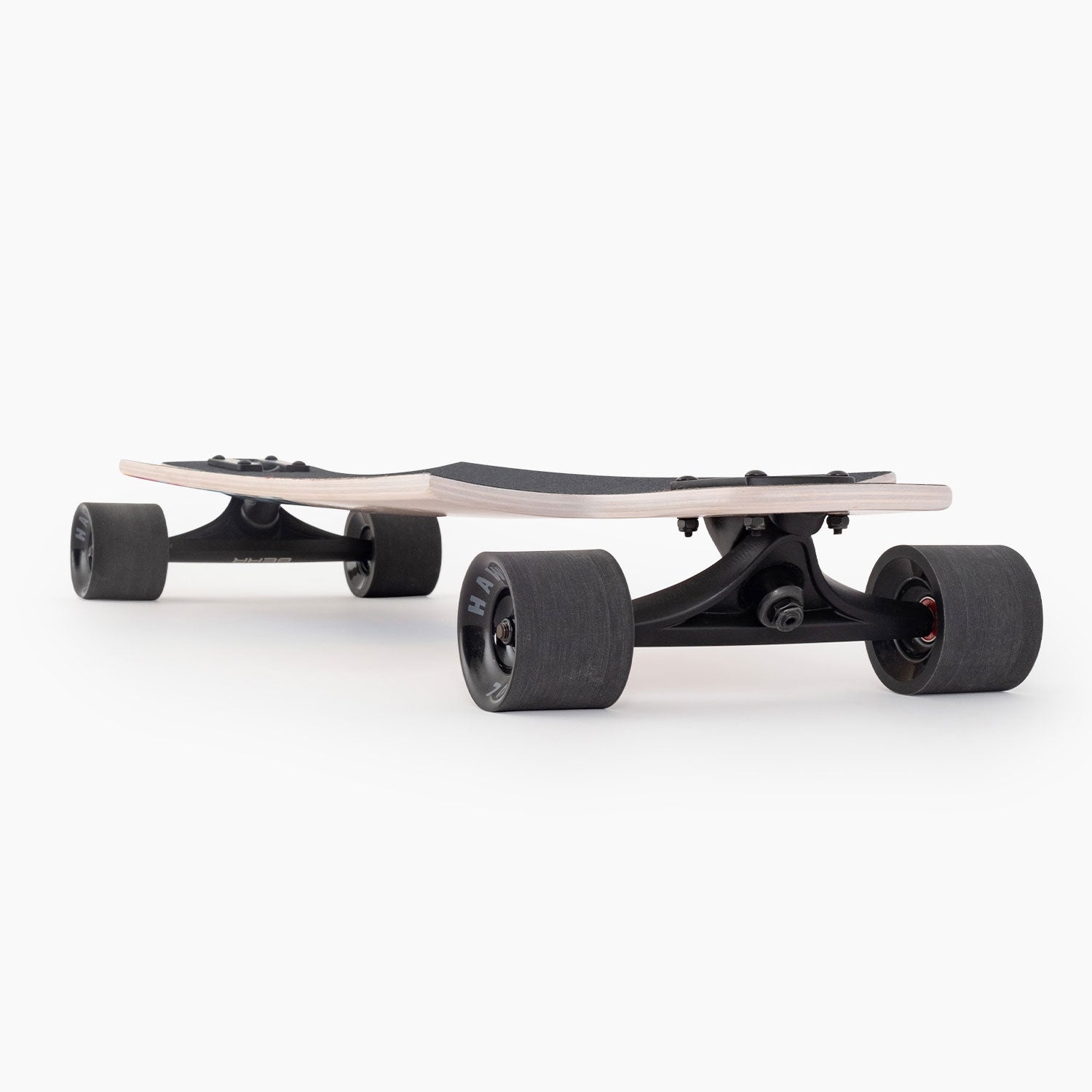 The Drop Hammer is a symmetrical drop-through longboard measuring 36.5″ long and 10″ wide. Its low ride height makes it an ideal city commuter and its medium concave and reasonably stiff construction make it a perfect board for an introduction to freeriding and carving on bigger hills. The Drop Hammer has been modified to work perfectly with the new Grizzly Gen 6 180mm trucks for maximum turning and super deep carves. 70mm 78a Supremes finish the set up off for super smooth slides.