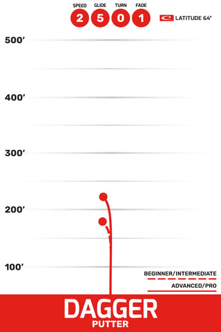 The Dagger is a deep dish putter with a bead. The deep dish means that more air can be trapped underneath the disc, making the Dagger stay longer in the air. The slow and stable flight gives you more control in your short game.