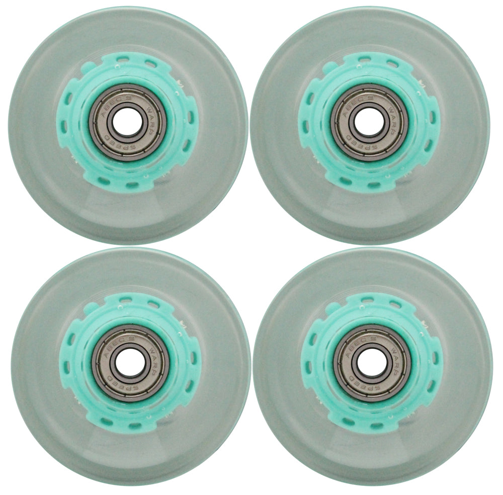 Light up the night with this awesome set of 4 60mm GREEN LED wheels! Each wheel includes 3 super bright LED lights that shine for over 10,000 hours! No batteries needed, these are powered by centrifugal force. The faster you go the brighter they get! Speaking of going FAST, these wheels come with ABEC 9 Bearings! The clear urethane transmits and magnifies the LED lights, coming in at 78a, these wheels ride FAST, SMOOTH and BRIGHT! (please note, this listing includes Wheels, Bearings and Spacers only, DOES NOT INCLUDE a complete skateboard)