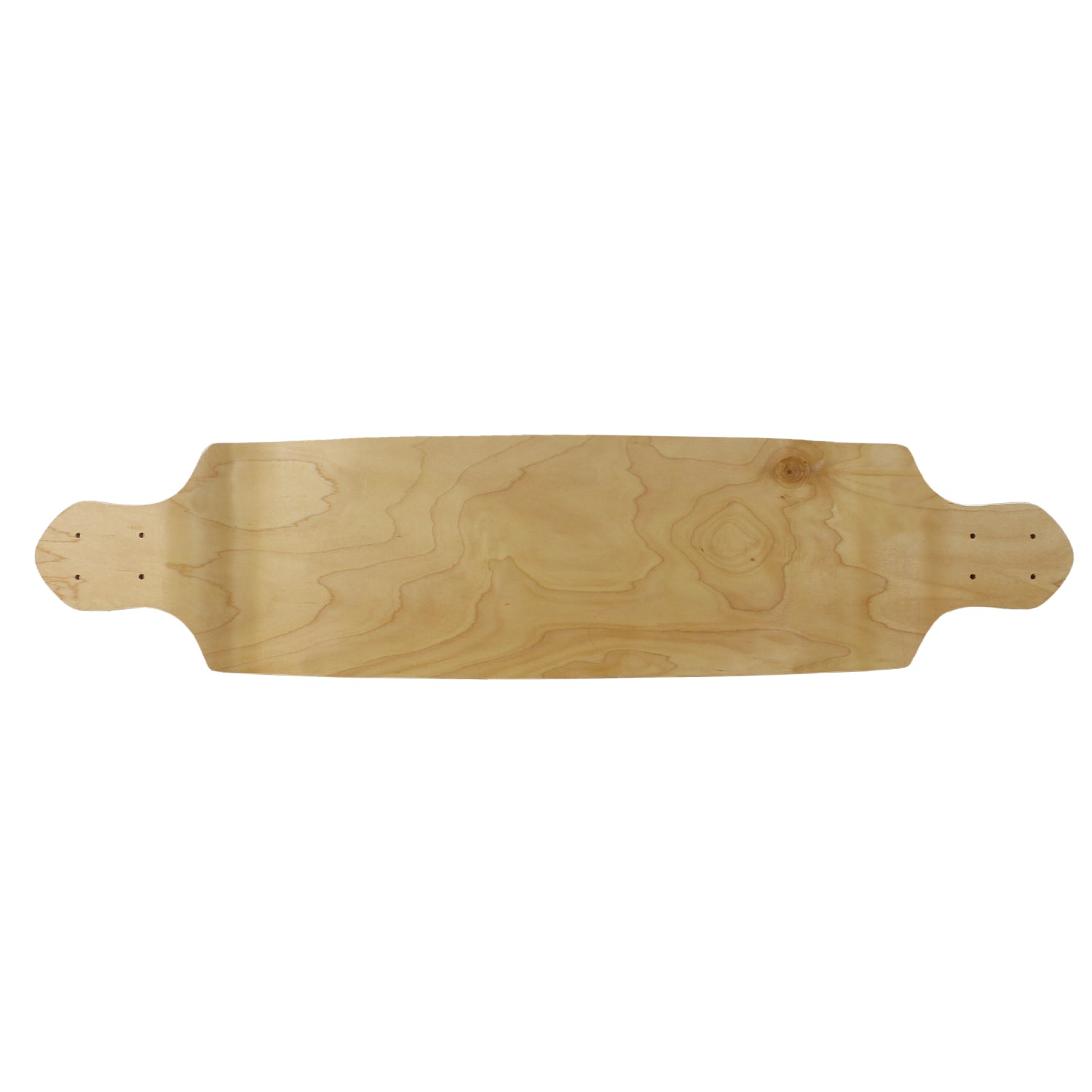 This longboard has a unique shape where the middle of the deck is lower than where the trucks are mounted. The trucks are actually placed higher than the standing platform which allows for greater stability at high speeds. Deck Specs: Width: 9.75". Length: 41.5". Wheelbase: 32.5". Nose: 1.5". Tail: 1.5".
