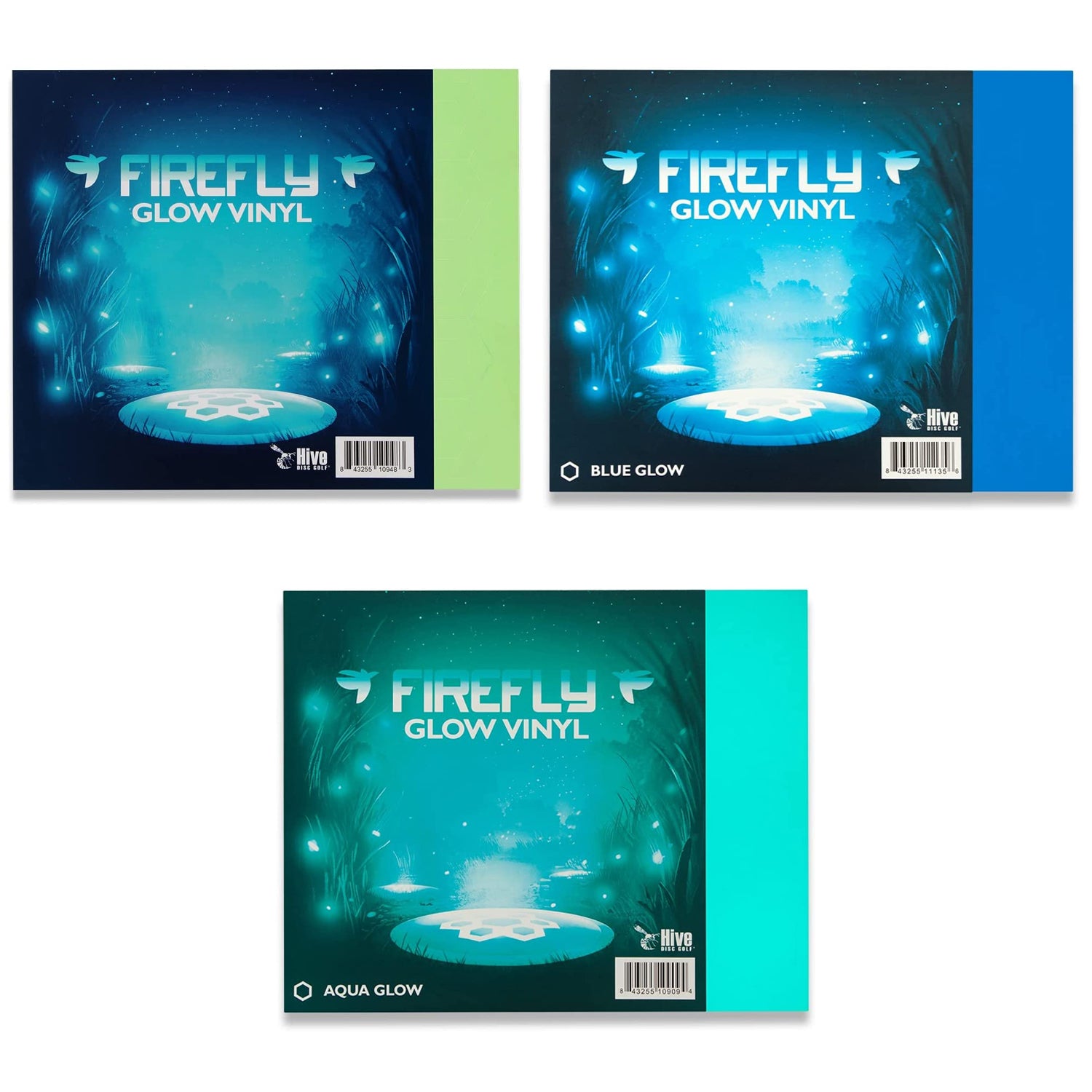 Are some of your go-to discs not in Eclipse plastic? Fear not, Firefly Glow Vinyl from Hive is here to save your night golf game! These glow vinyl stickers attach easily to any disc and provide a level of glow that, when exposed to UV light, is Eclipse 2.0 on the go. The level of brightness has to be seen to be believed – the brightest glow on the market! When your round is over, feel free to peel the Firefly Glow Vinyl off and place it back on the sheet for the next round – that’s right, these are easily re-attachable as well! Each sheet has 46 stickers (23 small hexagons and 23 hexagon rings) – plenty of glow for your whole bag. Give every disc the glow it deserves with Firefly Glow Vinyl!