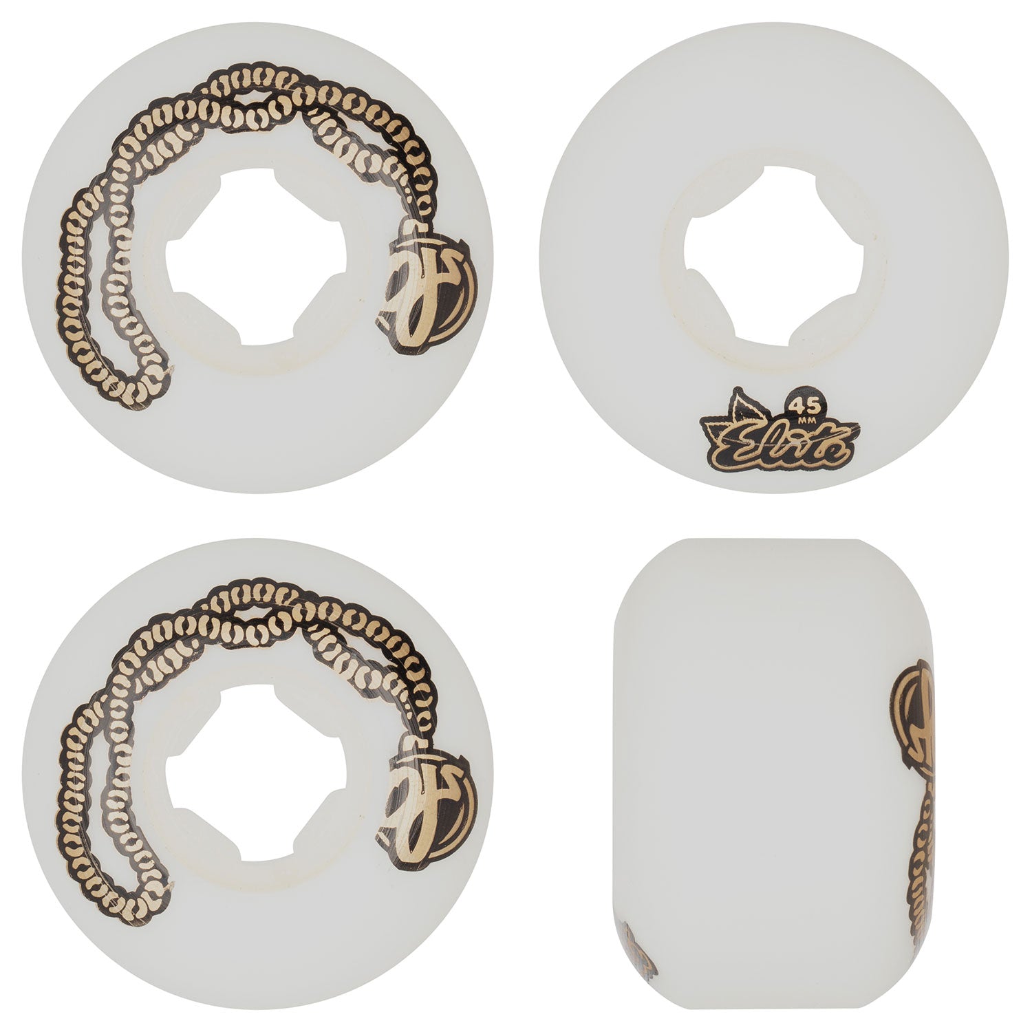 OJ Wheels 45mm, 99a Lil Bling Blings Mini Chubbies Wheels in white featuring OJ's newest small wheel shape based on Speed Wheels Chubbies of the 90's with 16.5mm riding surface and 30.5mm wide Mini Chubbies design. Custom cereal box packaging.