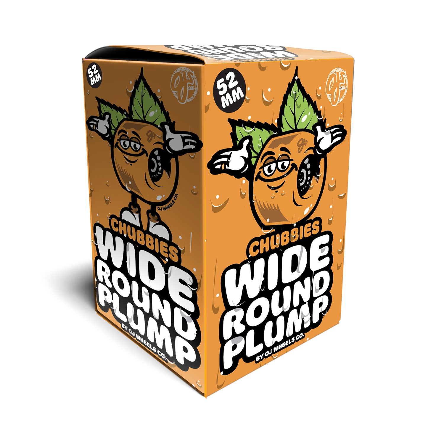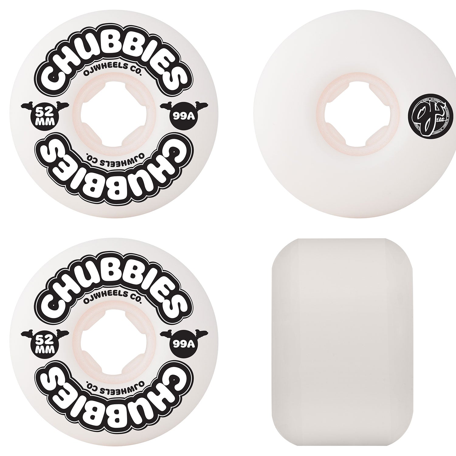 OJ Wheels 54mm Chubbies with 99a Team Line Original Formula urethane. They're Wide, Round, and Plump! OJ's all new Chubbies shapes feature a super-wide riding surface for the best slides, with big round radial edges that make getting on-and-off of curbs, ledges, and edges effortless. Team Line Original formula is custom engineered to give you the original look and feel of OJ Speed Wheels with today's performance urethane that offers industry leading speed and reduced flat spots, with all terrain capability for any surface.