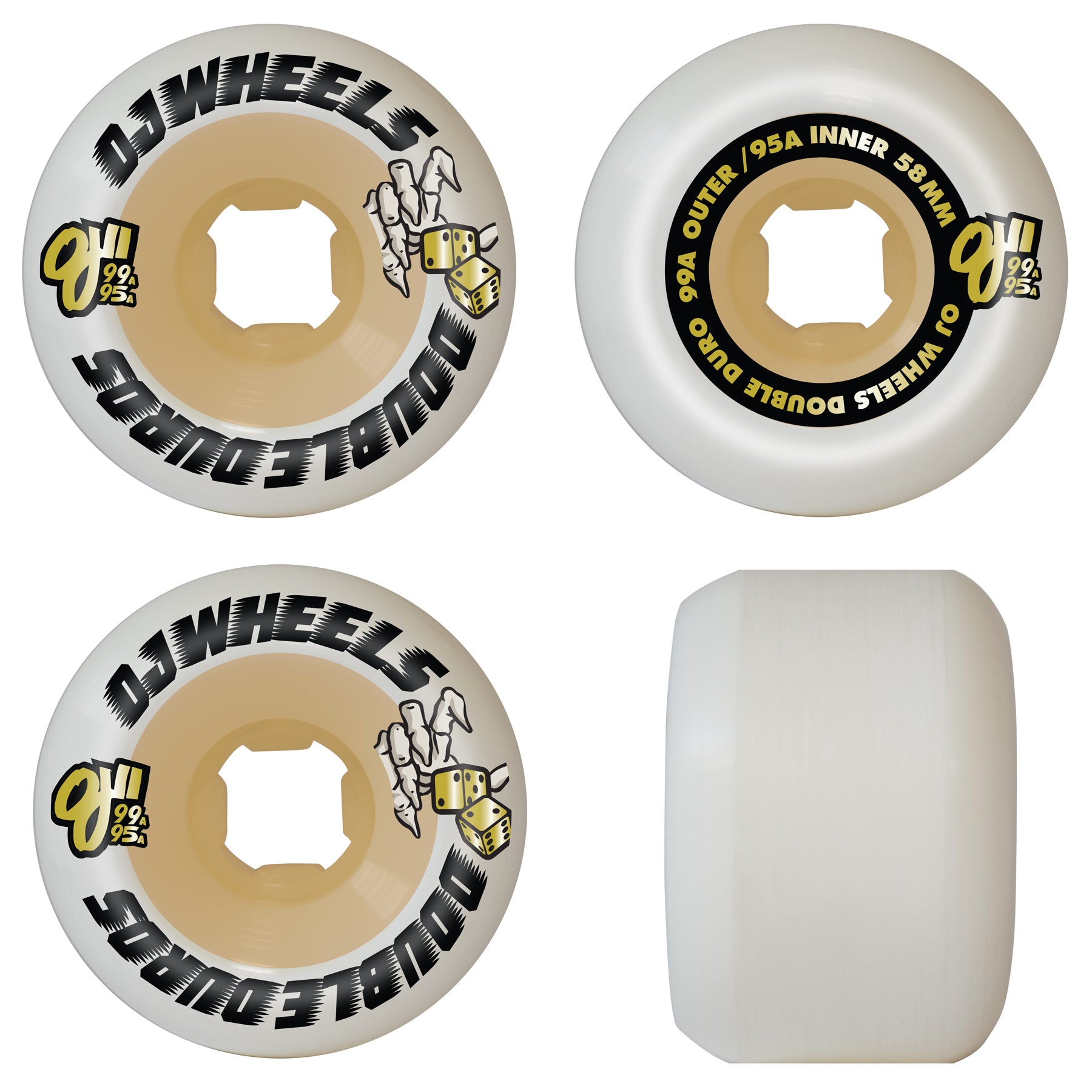 Double Duros are a new approach to wheel design and manufacturing from OJ Wheels featuring a 99a outer durometer wrapped around a 95a inner durometer. Double Duros combine the benefits of our best 99a and 95a formulas, proven to absorb rugged terrain while providing the speed and slide of 99a urethane. The built-in suspension of true, high performance 95a urethane rolls smooth on the roughest spots.