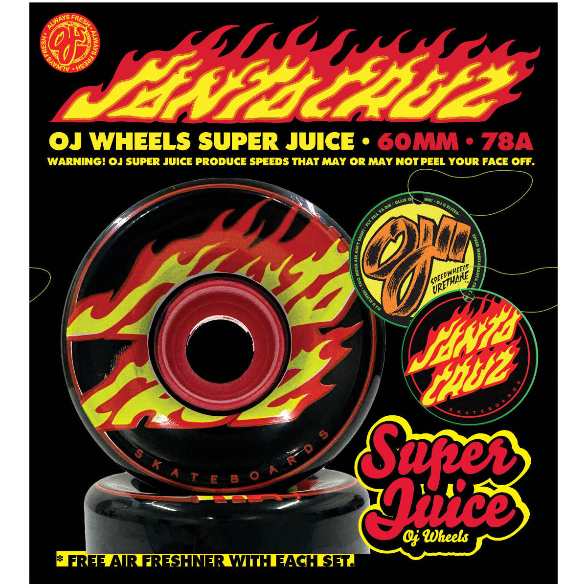 OJ Wheels Santa Cruz Skateboards Flame Dot Super Juice Black 60mm, 78a. Double-sided OJII / Flaming Dot air freshener included. 60mm x 45mm, 78A.