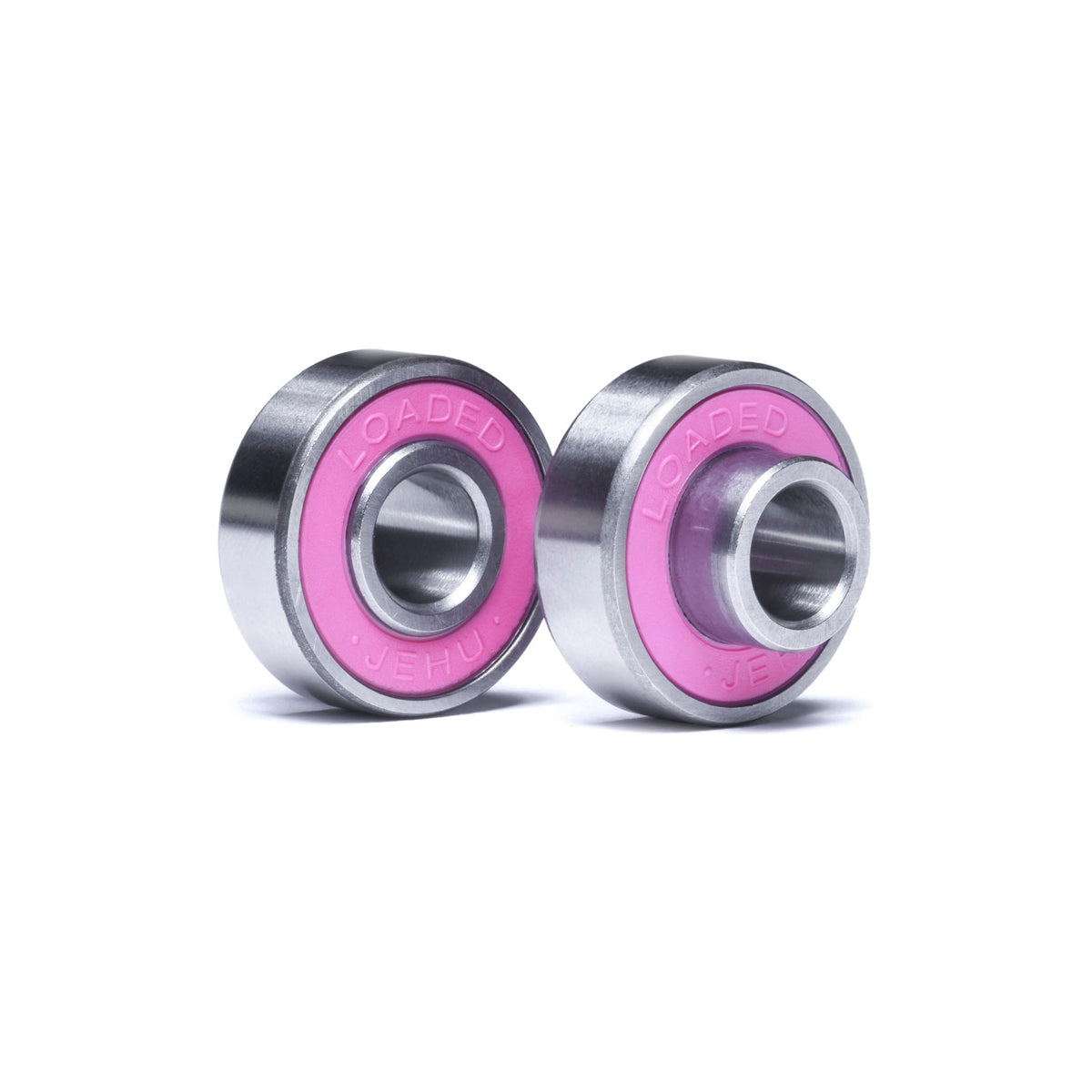 The new Loaded Jehunion Bearings (version 2 of our original Jehu bearings) feature extended inner raceways to eliminate the need for separate spacers and speed rings. Crank them all the way down and keep your setup tight. Rubberized steel shields for durability and ease of maintenance. Highest-grade chromium steel. Interior step ring to maintain constant lubrication. Developed and tested for the speed, durability, and the rigors of performance longboarding.
