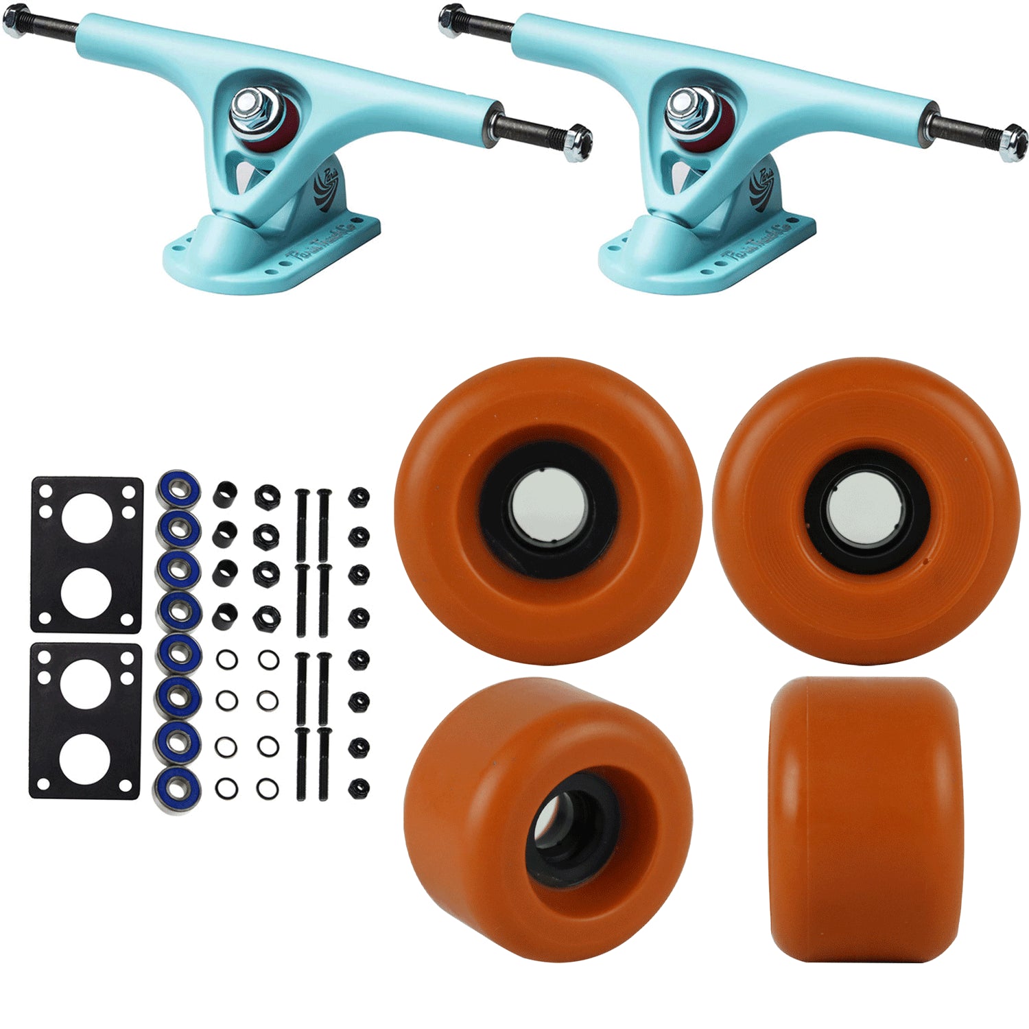 HARDWARE: This kit inicludes Abec 7 Bearings, Bearing Spacers, 1.5" Hardware, and 6mm Riser Pads.