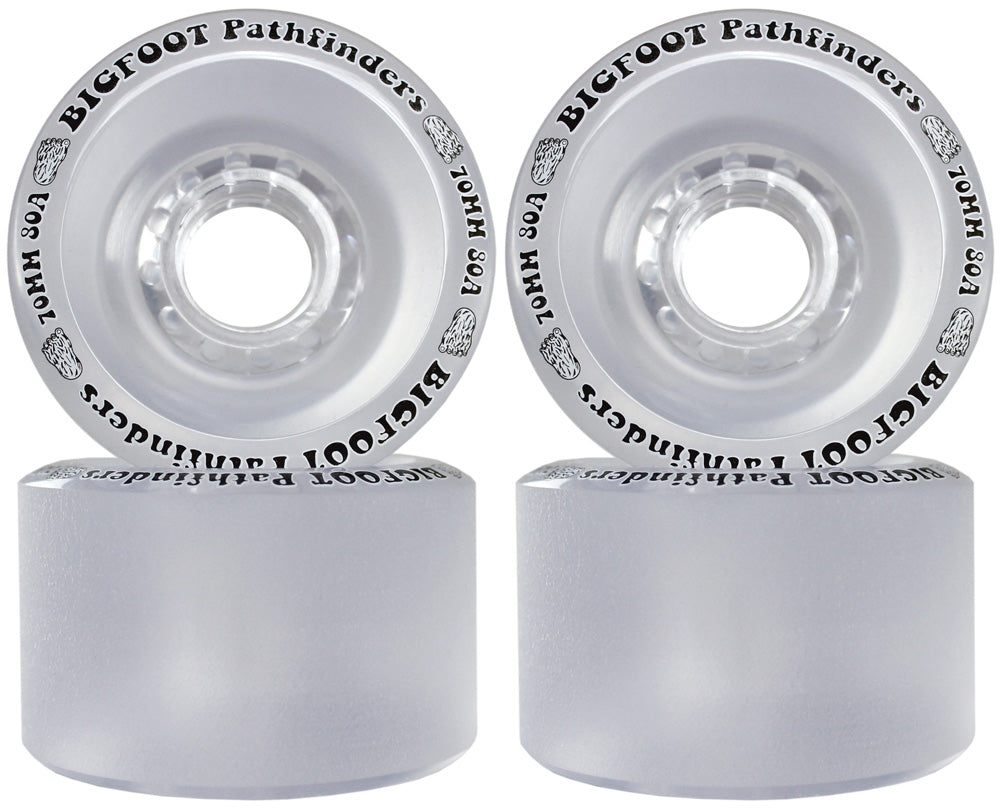 WHEELS: The Bigfoot Pathfinders come in at 70mm x 45mm with a 39mm contact patch. Poured with the latest 80a SHR formula. Featuring a stone-ground contact patch with a center-set clear hub & acute angled lips. Our R&D team put these wheels together for freeriding and sliding!