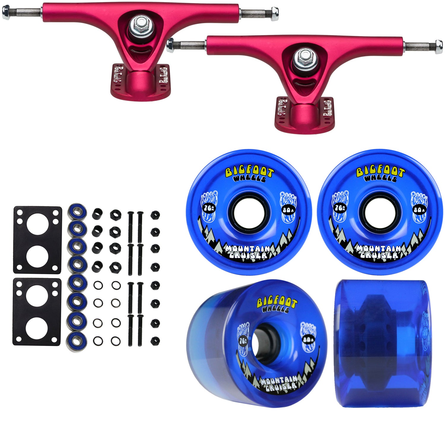 Paris Longboard Trucks, Wheels, Hardware, and Abec 7 Bearings Kit - V2 180 Fuschia + Bigfoot 76mm 80A Blue