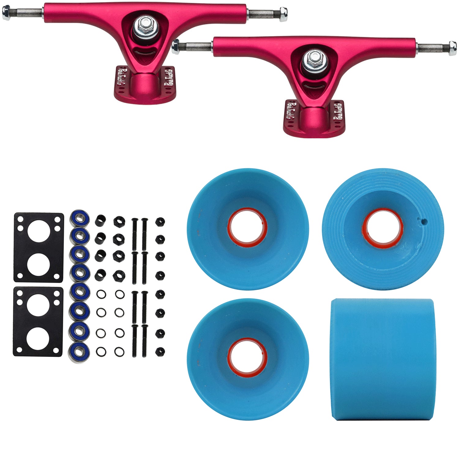 This longboard package contains everything you need to upgrade your set up, or build a new one. Paris V2 180mm Fuschia Trucks, Blank 64mm Cyan Blue Wheels, Abec 7 Bearings, 1.5" Hardware, and 6mm Risers are included with this "Just add wood" package.
