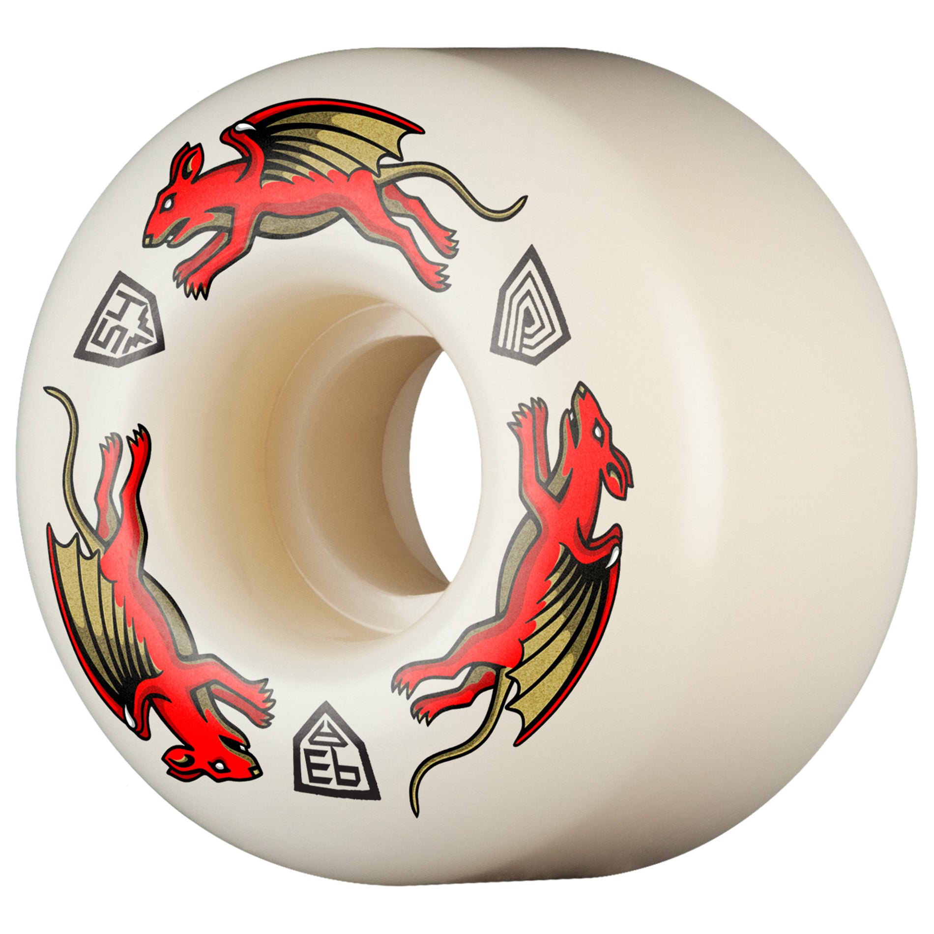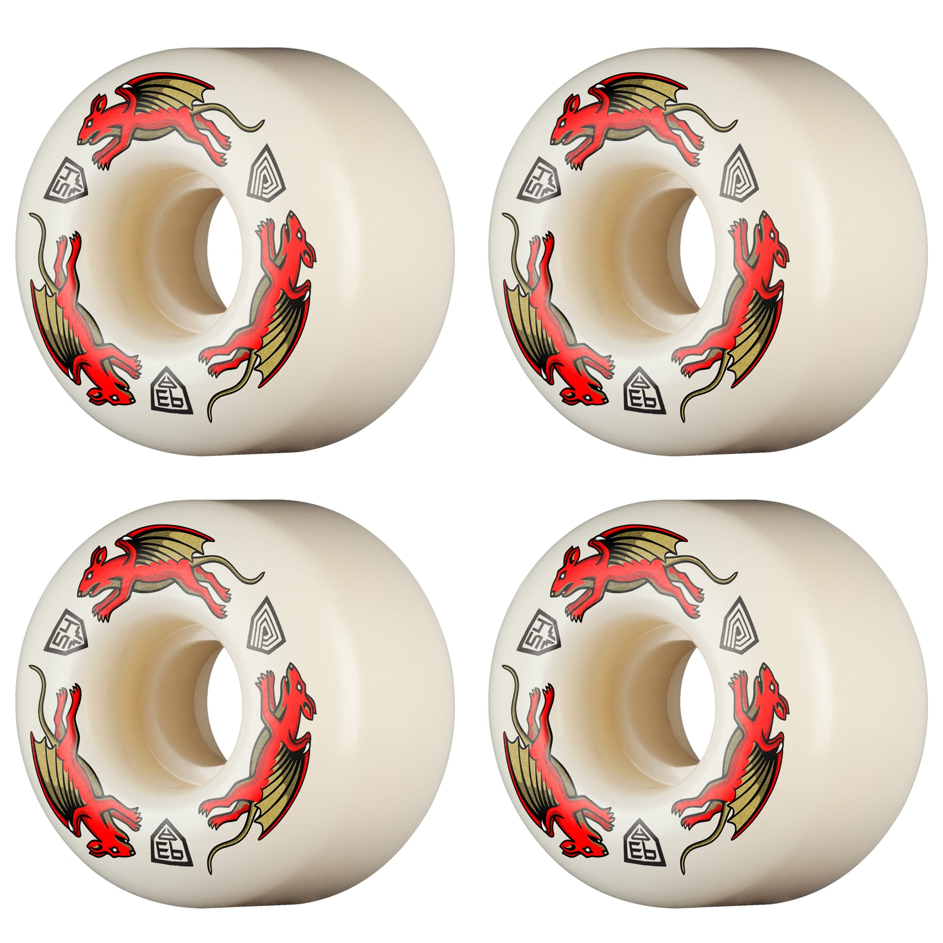 93A Dragon Formula: The amazing Dragon Formula (DF) Urethane used to create these wheels is another industry leading innovation from Powell Peralta. DF-93A Dragons will not only roll over rough terrain, but also grip and slide like 99A and 101A wheels do, so that you can do all your normal tricks and more on the greater range of skate terrains made skateable by its softer 93A hardness. Dragons are very fast because DF-93A is super high rebound, an industry leading 18-20% higher than hard wheels. This higher rebound means you won’t lose speed in bowls or parks the way you would with an ordinary 93A wheel, and you will roll much smoother and faster on rough streets and sidewalks. Dragons slide on both rough and smooth terrain, when you need it. This is because Dragon Formula is not a normal urethane formulated to be a mid-90's wheel, it is a unique formulation developed by our R&D group over a 10 year period to optimize and fine tune it to perfection. Dragon Formula wheels are not only smooth, fast, and slidable, they are also among the longest lasting wheels available. This makes them a super value at the same time, so don’t think you are saving money by buying a low cost, low performance wheel. Choose Dragon Formula wheels, and have more fun skating longer.