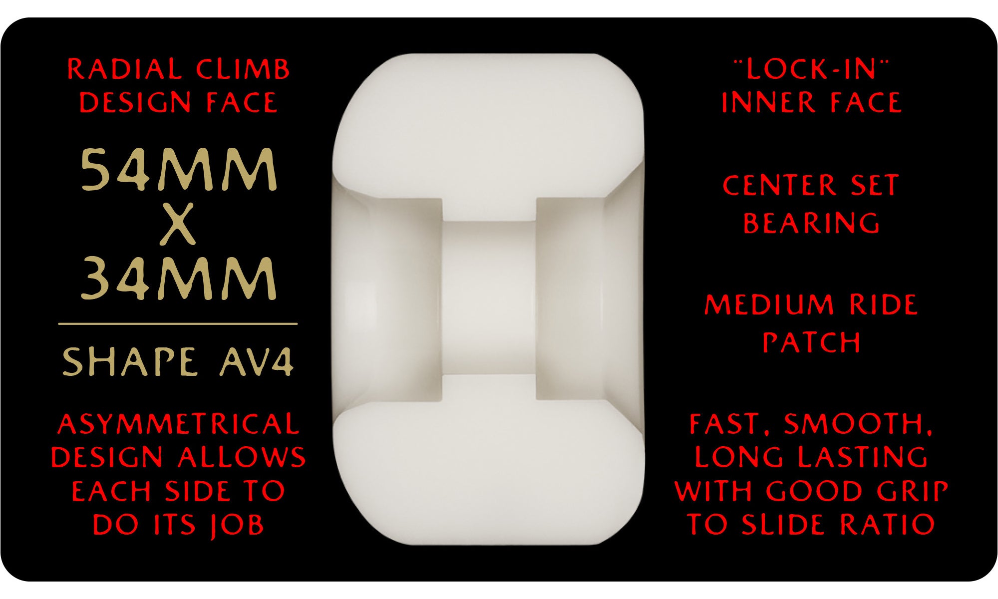 ABOUT THE AV4 NANO RAT SHAPE: Radial climb design face. Asymmetrical design allows each side to do its job. "Lock-in" inner face. Center set bearing. Medium ride patch.