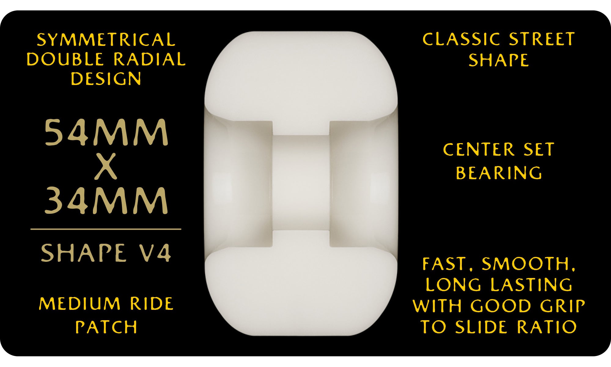 ABOUT THE V4 SHAPE: Symmetrical double radial design. Classic street shape. Medium ride patch. Center set bearing.