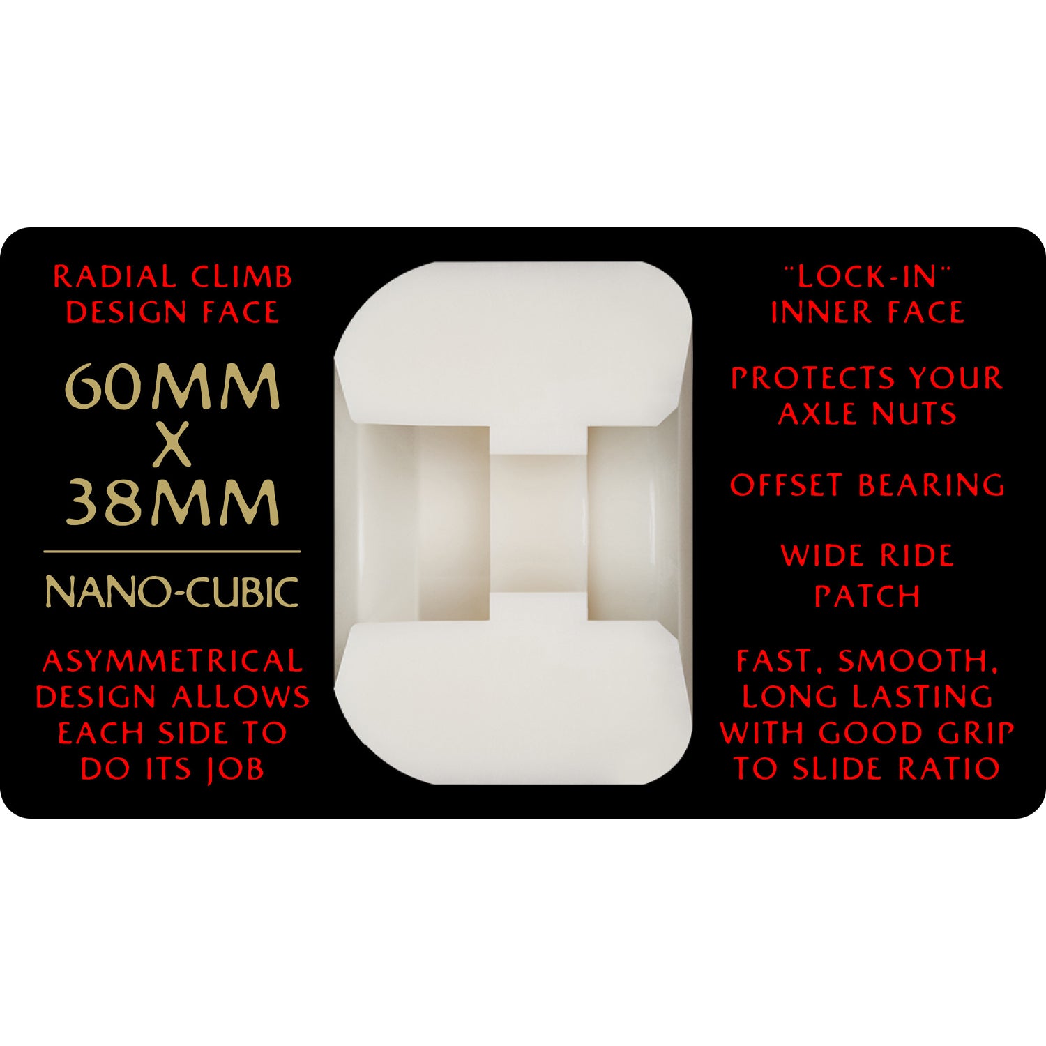 NanoCubics are inspired by and developed for Andy Anderson to help him expand his wide range of street, park and freestyle tricks on all terrains. NanoCubics feature the same classic design advantages, of the legendary Cubic and MiniCubic, reconceived for today's skating, and utilizing a special version of our amazing new Dragon formula. The NanoCubic's offset design allows it to have the perfect shape for both inner and outer edges to skate a wider range of obstacles. NanoCubics are smaller, lighter, and offset, so their large outer edge rolls up curbs, walls, and over cracks, and it covers your axle and nuts. The inner edge locks onto rails but releases when you need to.