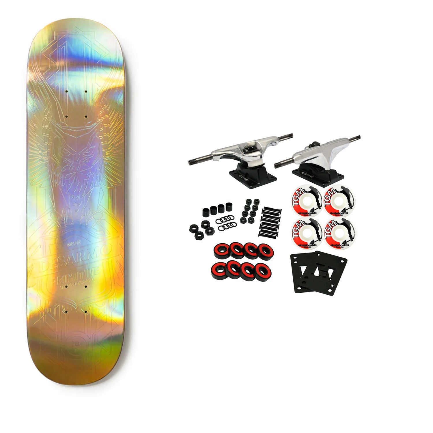 Deck measures 8.38" x 31.875" with a 14.1875" wheelbase. Constructed with 7-Ply North American Maple. This deck is part of limited series highlights the full line up of Primitive’s Pro Skateboarders and their unique spirit animal. Features the signature raised gold foil technique with a holographic finish. Comes with Core trucks, 52mm TGM logo wheels, Amp abec 5 bearings, Black Diamond Griptape, risers, and hardware. Core trucks are light weight and feature heavy duty aluminum with grade 8 steel kingpins and axles, as well as USA made bushings and pivot cups. 52mm 99A are the perfect wheels for both street and park skating. Like the name states, Amp bearings are stimulants for your wheels! Light synthetic oil, Delrin Crowns, and Rubber Serviceable Shields are a few of the things that makes these bearings one of the best Abec 5 rated bearings on the market. Arrives un-assembled which allows for customization and a feeling of accomplishment. Skaters love building their boards! Easy to assemble!