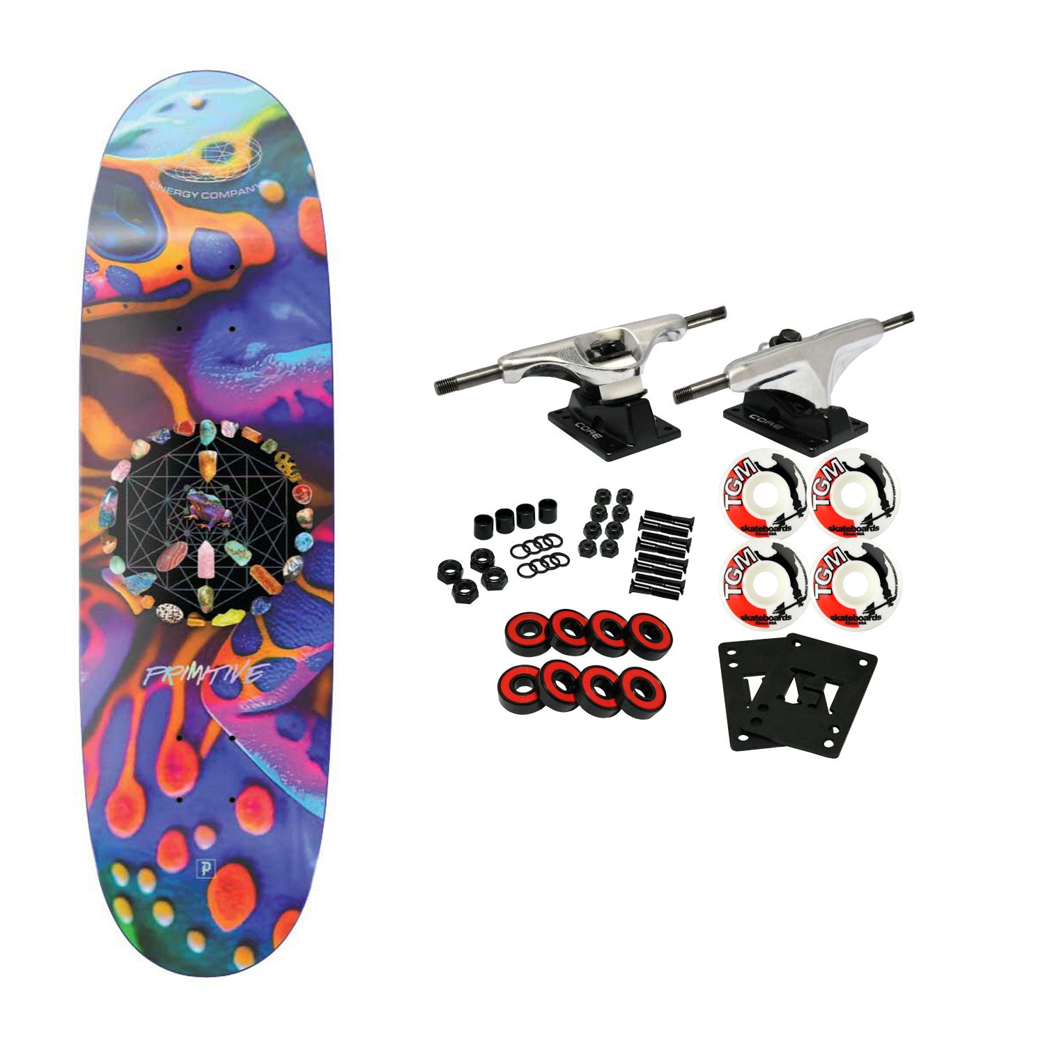 Energy Egg Shape from Primitive Skateboards. Constructed with 7-Ply North American Maple. Measures 9.125" x 32" with a 14.25" wheelbase. Features foil print, and medium concave. Comes with Core trucks, 52mm TGM logo wheels, Amp abec 5 bearings, Black Diamond Griptape, risers, and hardware. Core trucks are light weight and feature heavy duty aluminum with grade 8 steel kingpins and axles, as well as USA made bushings and pivot cups. 52mm 99A are the perfect wheels for both street and park skating. Like the name states, Amp bearings are stimulants for your wheels! Light synthetic oil, Delrin Crowns, and Rubber Serviceable Shields are a few of the things that makes these bearings one of the best Abec 5 rated bearings on the market. Arrives un-assembled which allows for customization and a feeling of accomplishment. Skaters love building their boards! Easy to assemble!