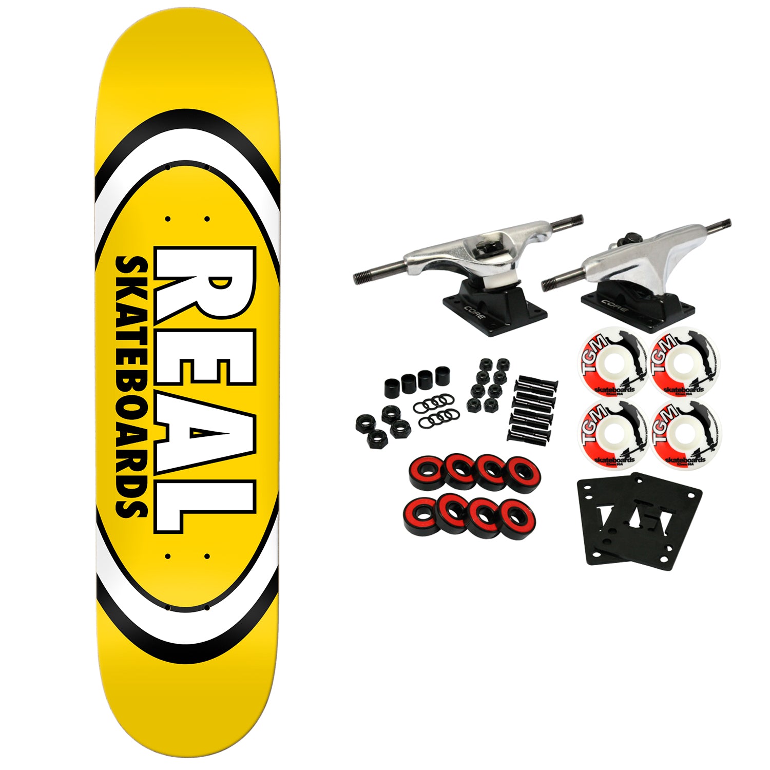 The Real Classic Oval deck measures 8.06" x 31.8" with a 14.38" Wheelbase. Real R1 Construction. The Original. Not too steep, not too mellow. Comes with Core trucks, 52mm TGM logo wheels, Amp abec 5 bearings, Black Diamond Griptape, risers, and hardware. Core trucks are light weight and feature heavy duty aluminum with grade 8 steel kingpins and axles, as well as USA made bushings and pivot cups. 52mm 99A are the perfect wheels for both street and park skating. Like the name states, Amp bearings are stimulants for your wheels! Light synthetic oil, Delrin Crowns, and Rubber Serviceable Shields are a few of the things that makes these bearings one of the best Abec 5 rated bearings on the market. Arrives un-assembled which allows for customization and a feeling of accomplishment. Skaters love building their boards! Easy to assemble!