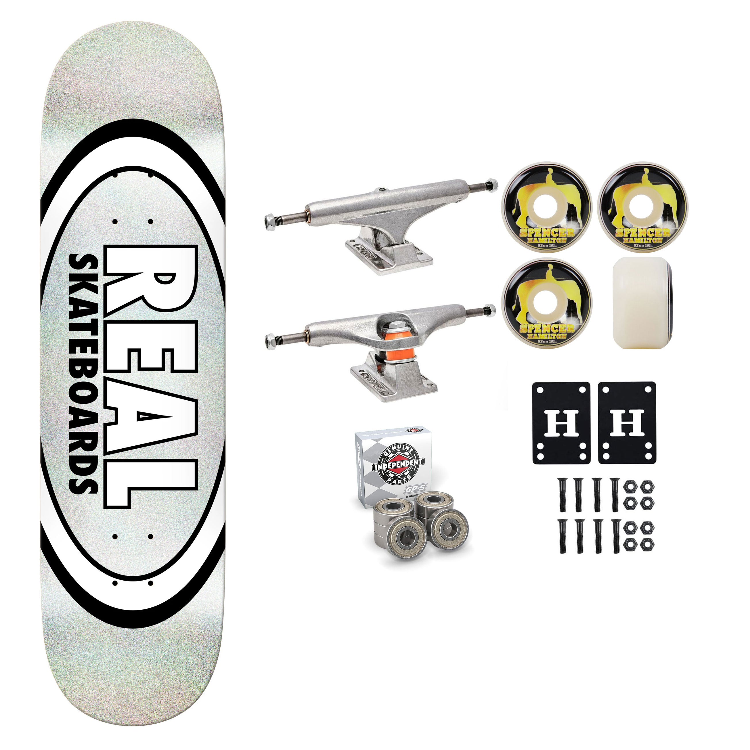 BEARINGS AND HARDWARE: Independent GP-S Bearings are engineered from the ground up with exclusive components. Key Features of Independent Genuine Parts Gp-S Skateboard Bearings: Dust proof metal outer shield, Serviceable shieldless back, All new faster and more durable Super Cage design, Micro polished steel races, Excellent oxidation resistance and corrosion protection, Water resistant, Extended wear protection. Also Includes 1" Phillips hardware and 1/8" Risers.