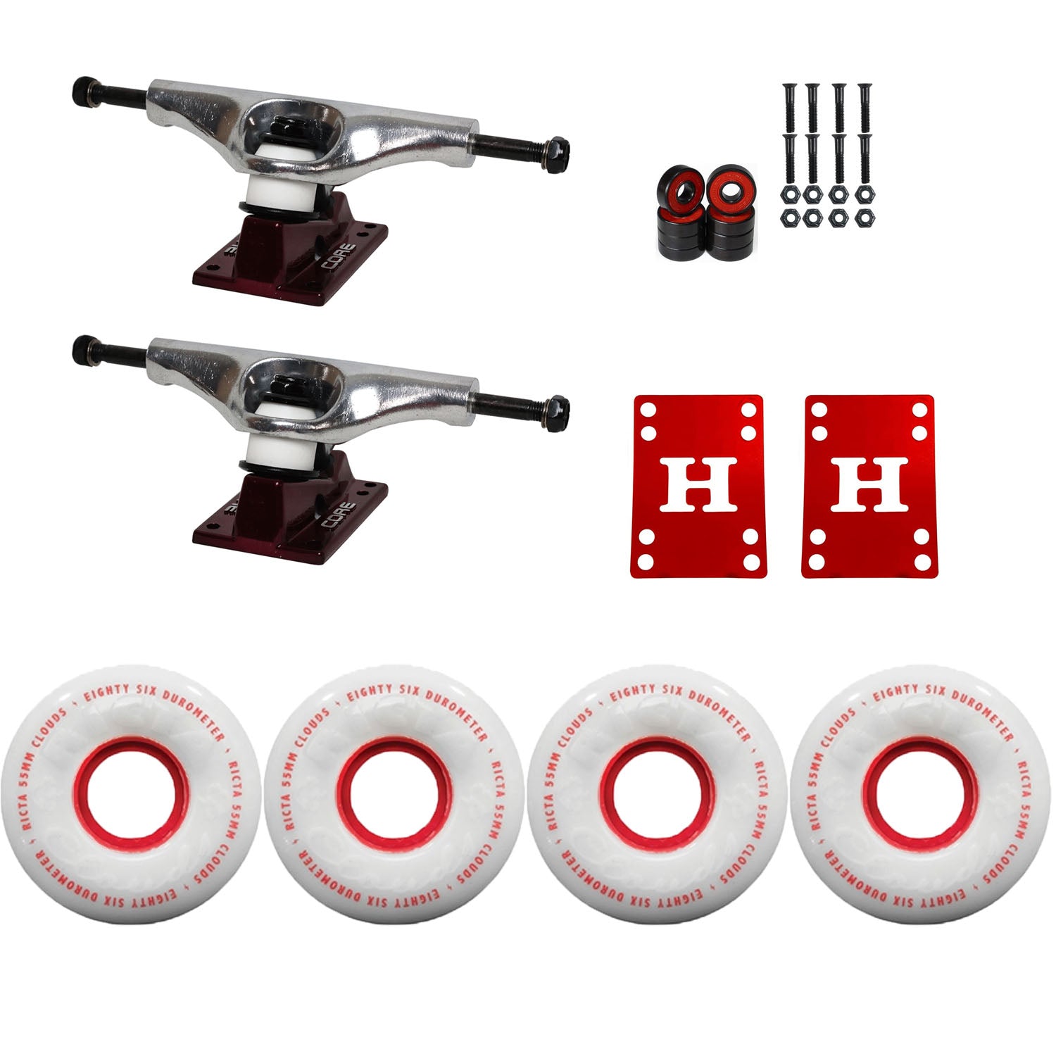 This package contains everything you need to make your deck a complete or transform your board into an easy rolling cruiser. Includes Core Hollow Kingping trucks, Ricta Soft Clouds wheels, Amp Abec 5 Bearings, Risers, and 1" Phillips Hardware. These core trucks offer hollow kingpins which simultaneously lower the weight of the truck while increasing strength and performance. Featuring hollow body kingpins, lightweight aluminum alloy hangers, heavy duty baseplates, and premium USA Made Bushings and Pivot Cups. Super high rebound (SHR) bushings and pivot cups offer a responsive, smooth, and consistent ride. All Core Trucks are assembled in the USA. Ricta 86a Clouds are perfect for rolling on rough surfaces that would be difficult or impossible to skate with regular hard wheels. Excellent for ditches and rough street spots, 86a Ricta Clouds are a bit harder than our softer 78a Clouds. They still handle like a street/park wheel and even slide well. Ricta 86a Clouds are an excellent hybrid wheel for rugged spots. Core 5.5 trucks fit boards from 8.0" to 8.5" wide.