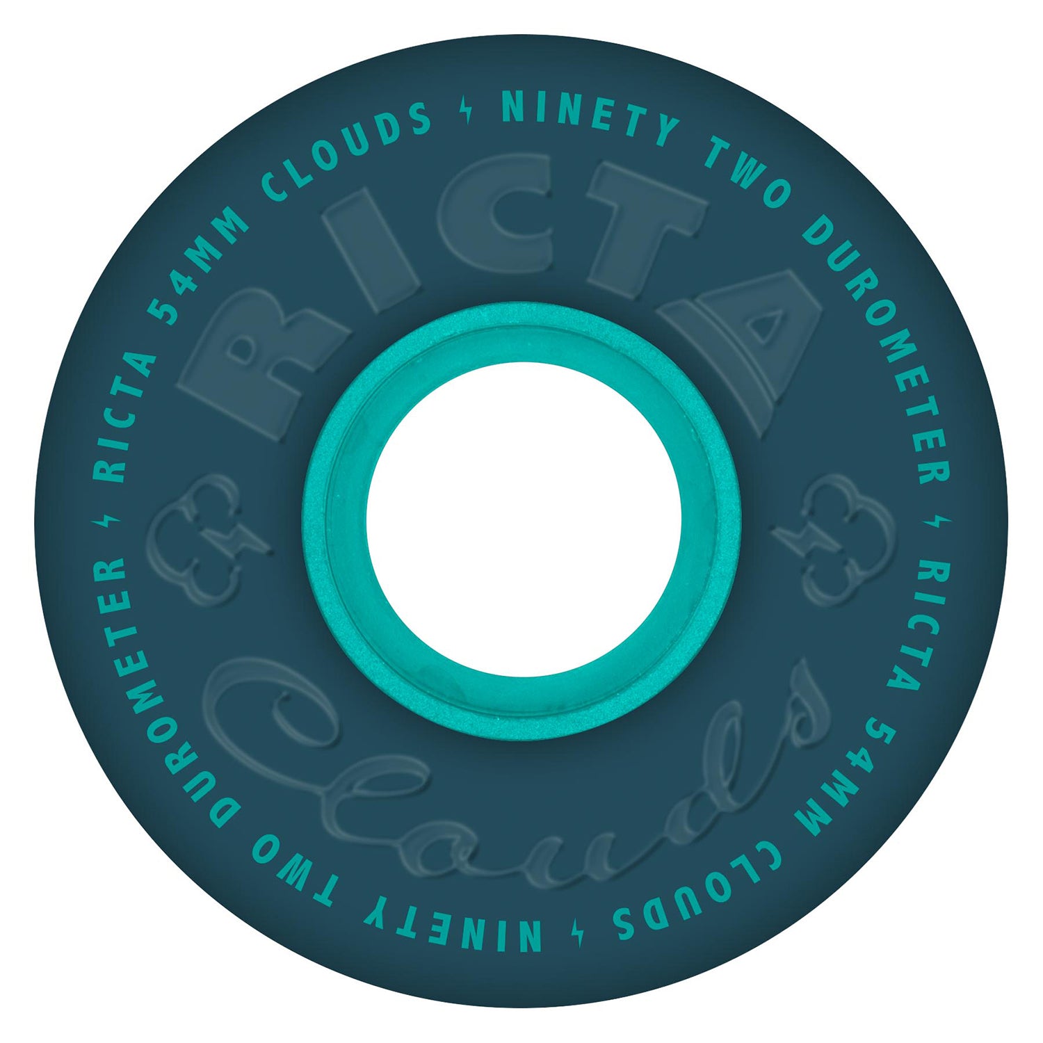 The Ricta Clouds Navy 54mm, 92a wheels feature teal colored 92a urethane and aqua colored core, with debossed and pad printed lettering on a soft yet firm 92a urethane: perfect for filmer setups or skating rougher terrains.