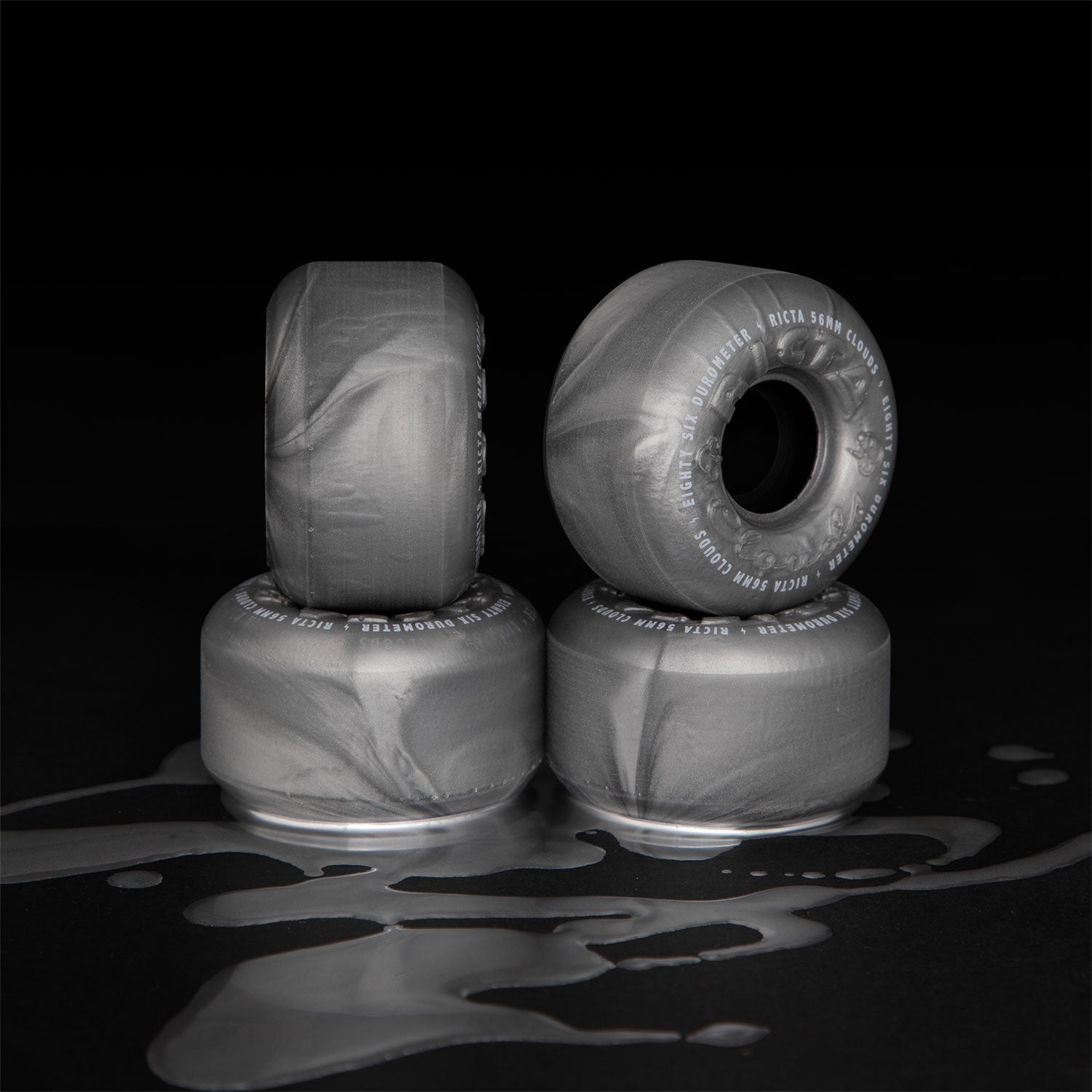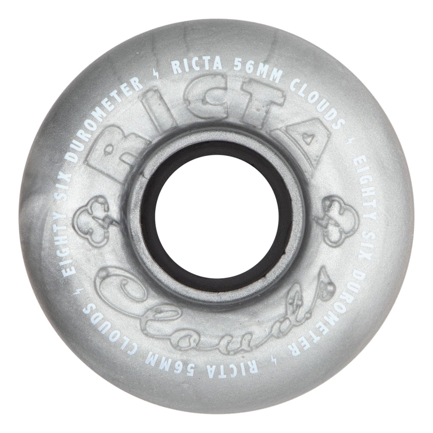 Ricta Wheel Dynamics 56mm, 86a Clouds in metallic silver with black core and debossed and pad printed lettering. Medium-soft urethane for filmer setups, skating ditches and rougher terrains.