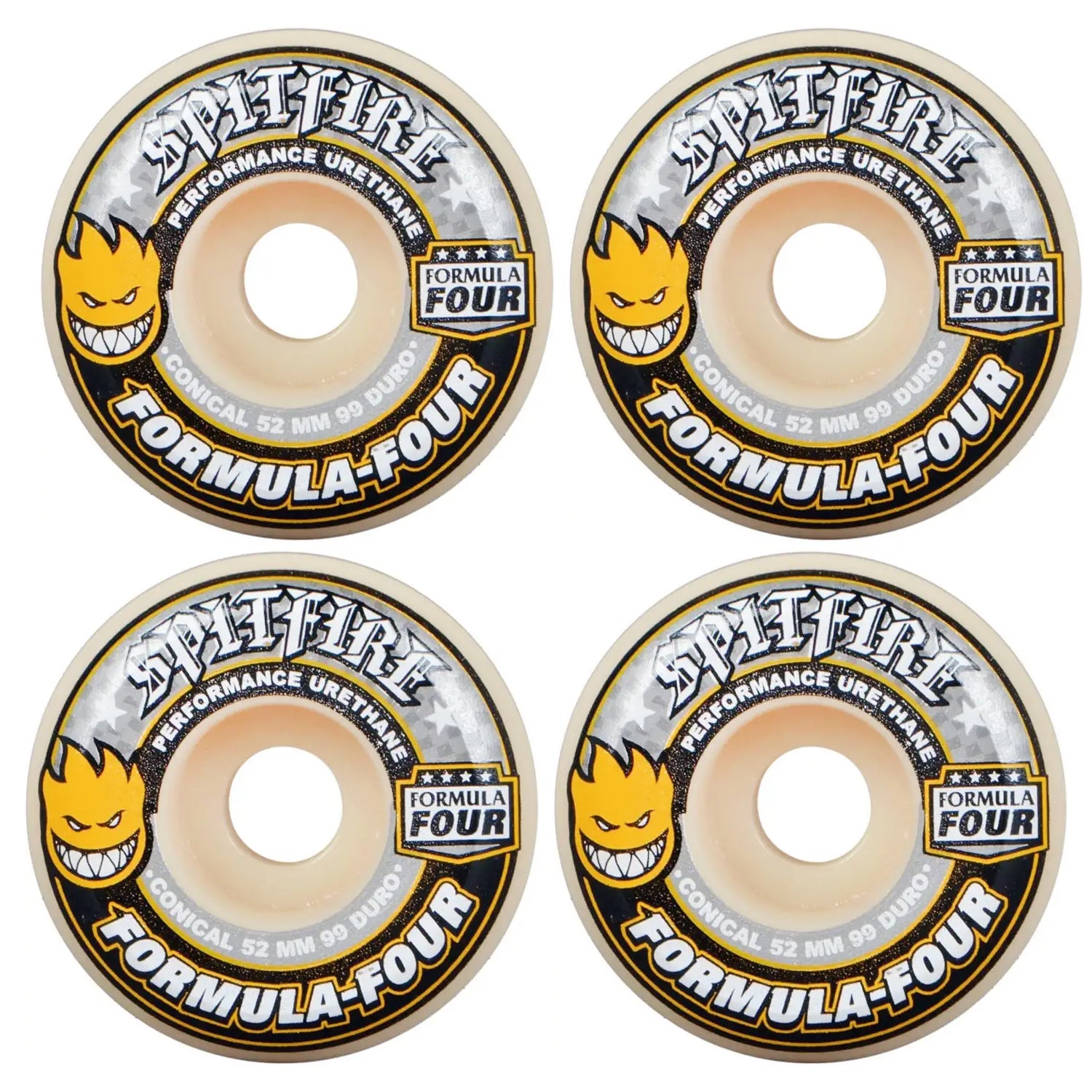 7 ply North American Maple pressed individually using epoxy making a strong, responsive deck with long lasting pop and consistent concave and kick. Deck Measures 8.375" x 32". Durable, high performance truck for all types of skateboarding. 356 T6 Aluminum hanger and baseplate, solid Chromoly steel axle, grade 8 kingpin, Indy cushions with cylinder bottom. Featuring superior turn and stability, better grind clearance, improved no hang-up yoke for grind tricks, and less wheel bite. They last longer and are stronger on impact than any other truck on the market. 55mm ride height. Standard 4-Hole Baseplate. 144s measure 8.25" from axle tip-to-tip. Recommended deck size 8.0" - 8.5". Includes 2 Trucks. Spitfire Formula Four Urethane Wheels. 99A Durometer, 52mm x 31.5mm. Conical Shape. A true performance conical shape. Hand cut for quick response and less weight. Spitfire Forumla 4 wheels feature unmatched abrasion resistance which equals fewer flat spots and smooth anti-stick slide for more controllable grip and lasting speed.