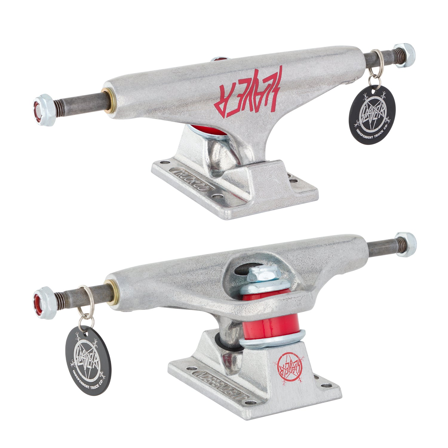 TRUCKS: Independent Stage 11 Slayer trucks feature polished silver hanger and baseplate with pad printed logos, red cushions and silver hardware with red nylon threads. Indy Stage 11 trucks are a durable, all purpose truck for any type of skateboarding. A356 T6 Aluminum Hanger & Baseplate. The best lightweight aluminum alloy heat treated to T6 condition for strength, durability, and grind feel.