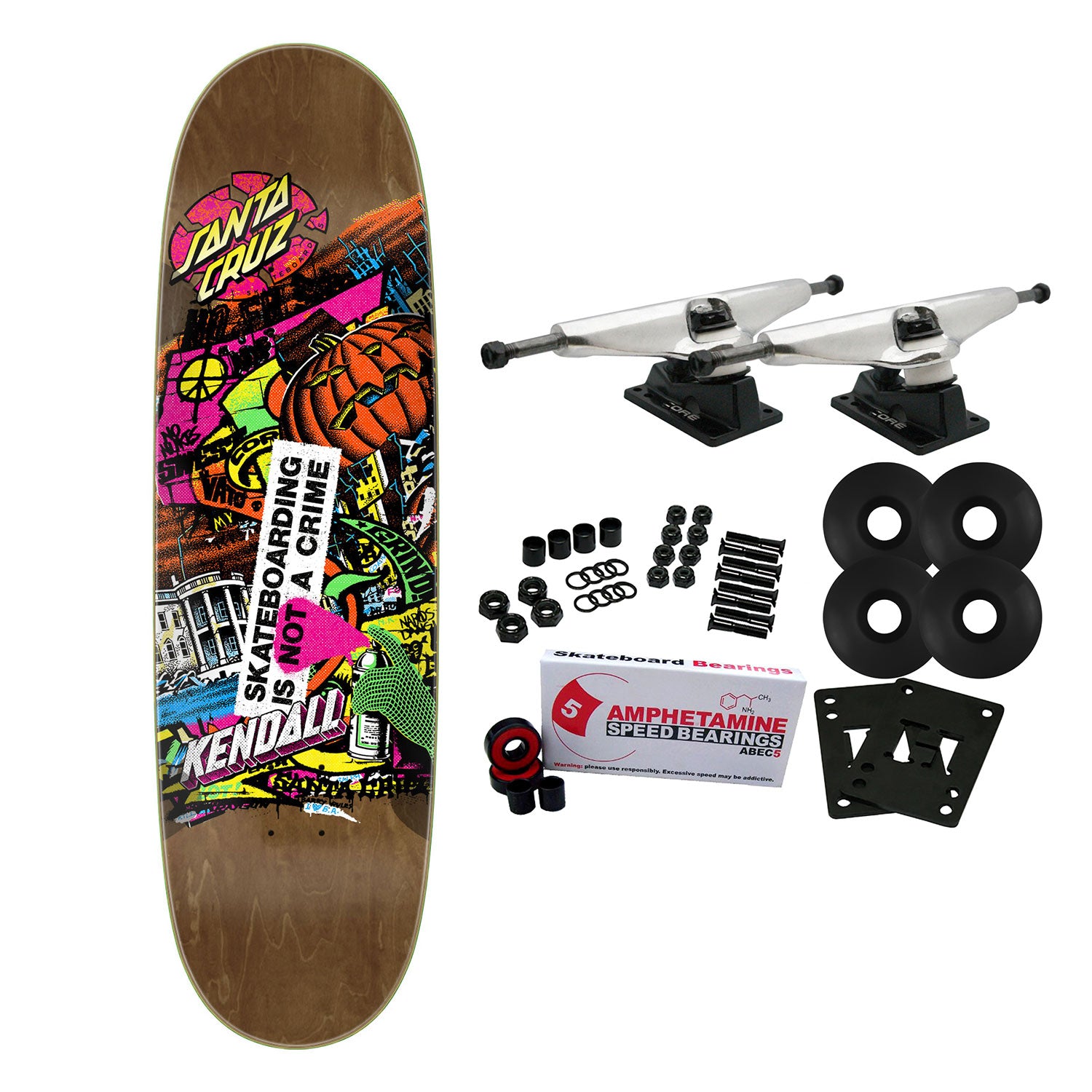 Santa Cruz Skateboards Jeff Kendall Street Art Collage VX Deck featuring spot matte and neon graphics on brown stained veneer with custom 9" egg shape with 4 wheel wells. Measures 9.0" x 32" with a 13.875" wheelbase. VX decks are thinner, stronger, and have more pop than standard 7 ply decks featuring 5 plies of North American Maple and 2 layers of Quad X technology. Comes with Core trucks, 58mm 97A wheels, Amp abec 5 bearings, Black Diamond Griptape, risers, and hardware. Core trucks are light weight and feature heavy duty aluminum with grade 8 steel kingpins and axles, as well as USA made bushings and pivot cups. 58mm 97A are the perfect wheels for both street and park skating. Like the name states, Amp bearings are stimulants for your wheels! Light synthetic oil, Delrin Crowns, and Rubber Serviceable Shields are a few of the things that makes these bearings one of the best Abec 5 rated bearings on the market. Arrives un-assembled which allows for customization and a feeling of accomplishment. Skaters love building their boards! Easy to assemble!