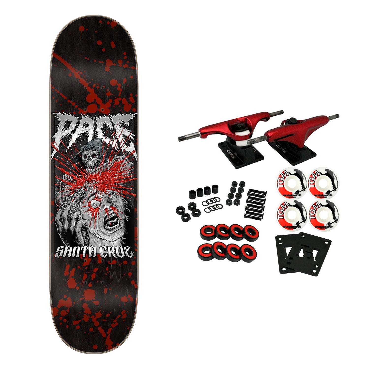 Santa Cruz Skateboards Rob Pace Chainsaw Pro Deck featuring spot gloss and matte graphics by bargainbinblasphemy with raised ink impact splatter background. 7 ply North American Maple pressed individually using epoxy - making a strong, responsive deck with long lasting pop and consistent concave and kick. ATV is a universal medium-depth concave with symmetrical nose and tail kick that performs well in all terrains on a wide variety of shapes - for anybody, anywhere. Comes with Core trucks, 52mm TGM logo wheels, Amp abec 5 bearings, Black Diamond Griptape, risers, and hardware. Core trucks are light weight and feature heavy duty aluminum with grade 8 steel kingpins and axles, as well as USA made bushings and pivot cups. 52mm 99A are the perfect wheels for both street and park skating. Like the name states, Amp bearings are stimulants for your wheels! Light synthetic oil, Delrin Crowns, and Rubber Serviceable Shields are a few of the things that makes these bearings one of the best Abec 5 rated bearings on the market. Arrives un-assembled which allows for customization and a feeling of accomplishment. Skaters love building their boards! Easy to assemble!