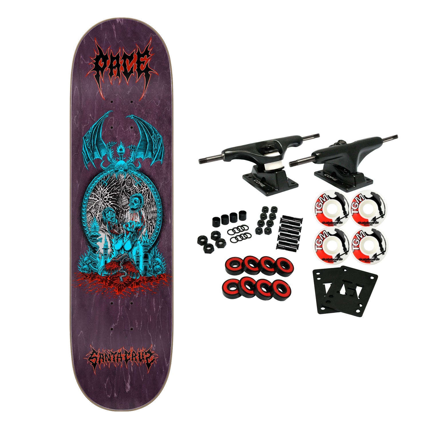 Santa Cruz Skateboards Rob Pace Mirror Pro deck with spot matte graphics on purple stained veneer. Art by Taylor Smith. Comes with Core trucks, 52mm TGM logo wheels, Amp abec 5 bearings, Black Diamond Griptape, risers, and hardware. Core trucks are light weight and feature heavy duty aluminum with grade 8 steel kingpins and axles, as well as USA made bushings and pivot cups. 52mm 99A are the perfect wheels for both street and park skating. Like the name states, Amp bearings are stimulants for your wheels! Light synthetic oil, Delrin Crowns, and Rubber Serviceable Shields are a few of the things that makes these bearings one of the best Abec 5 rated bearings on the market. Arrives un-assembled which allows for customization and a feeling of accomplishment. Skaters love building their boards! Easy to assemble!