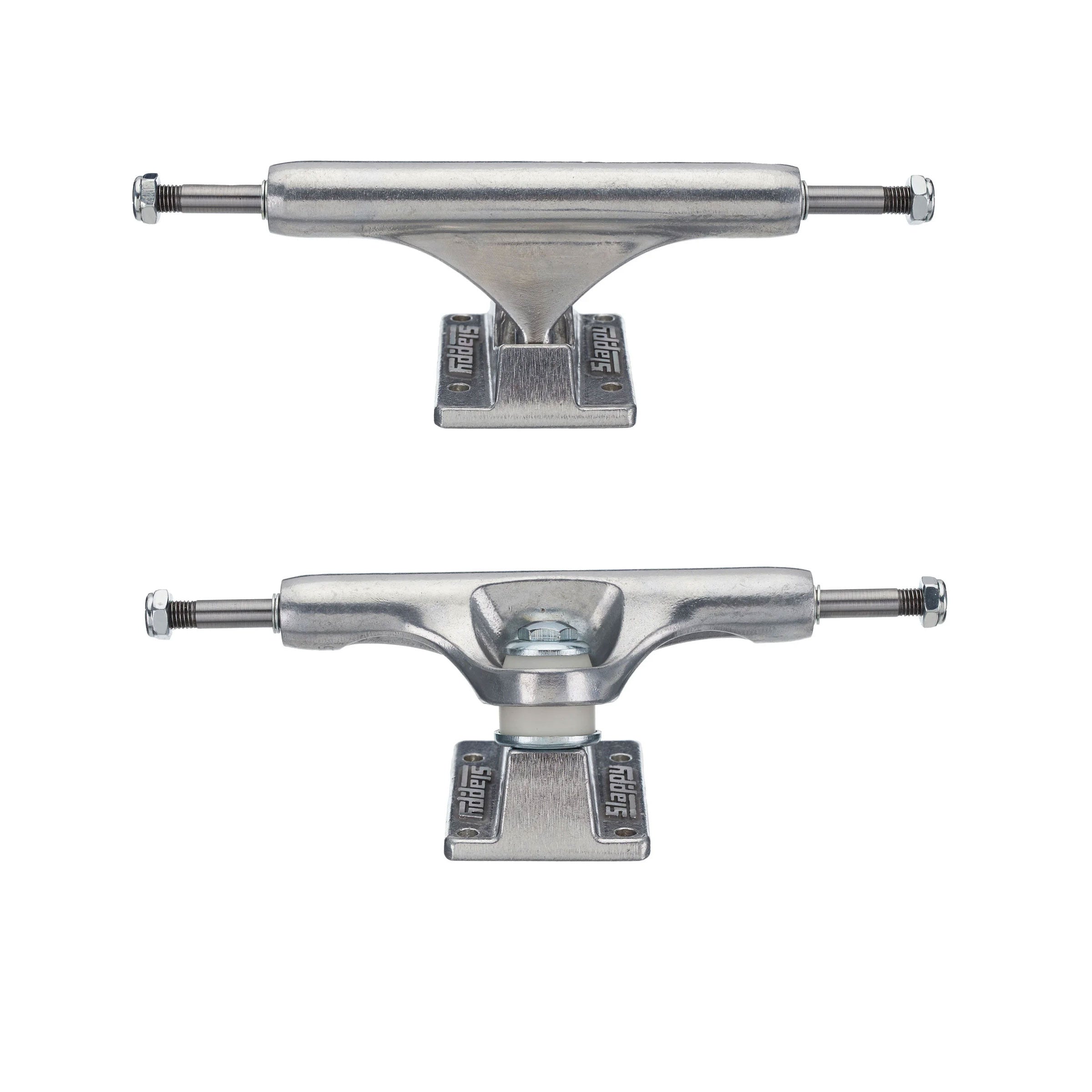 TRUCKS: The concept of Slappy trucks is simple, the best grind clearance and turn possible. Slappy trucks are strong, light, and have the classic look and feel of a premium skateboard truck. Slappy trucks offer better grind clearance with no break in time, and less wheel bite. Inverted ST1 Hollow Trucks feature a hollow inverted kingpin, hollow axle, polished silver hangers, and polished silver baseplates.