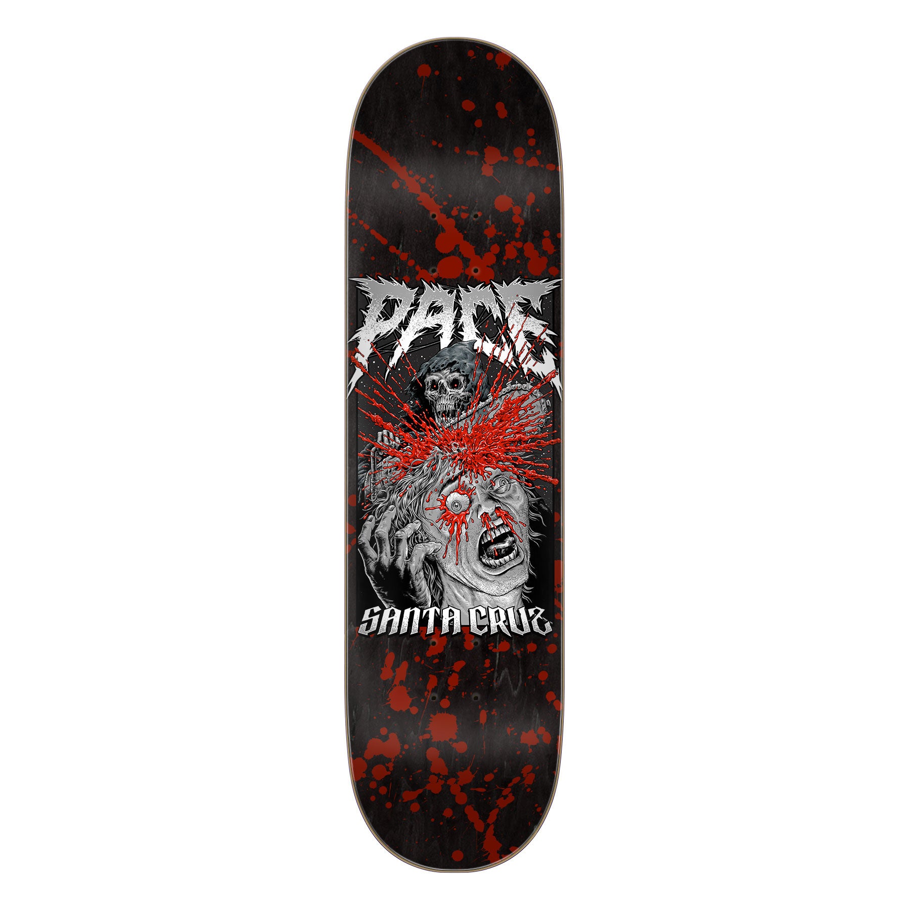 Santa Cruz Skateboards Rob Pace Chainsaw Pro Deck featuring spot gloss and matte graphics by bargainbinblasphemy with raised ink impact splatter background. 7 ply North American Maple pressed individually using epoxy - making a strong, responsive deck with long lasting pop and consistent concave and kick. ATV is a universal medium-depth concave with symmetrical nose and tail kick that performs well in all terrains on a wide variety of shapes - for anybody, anywhere.