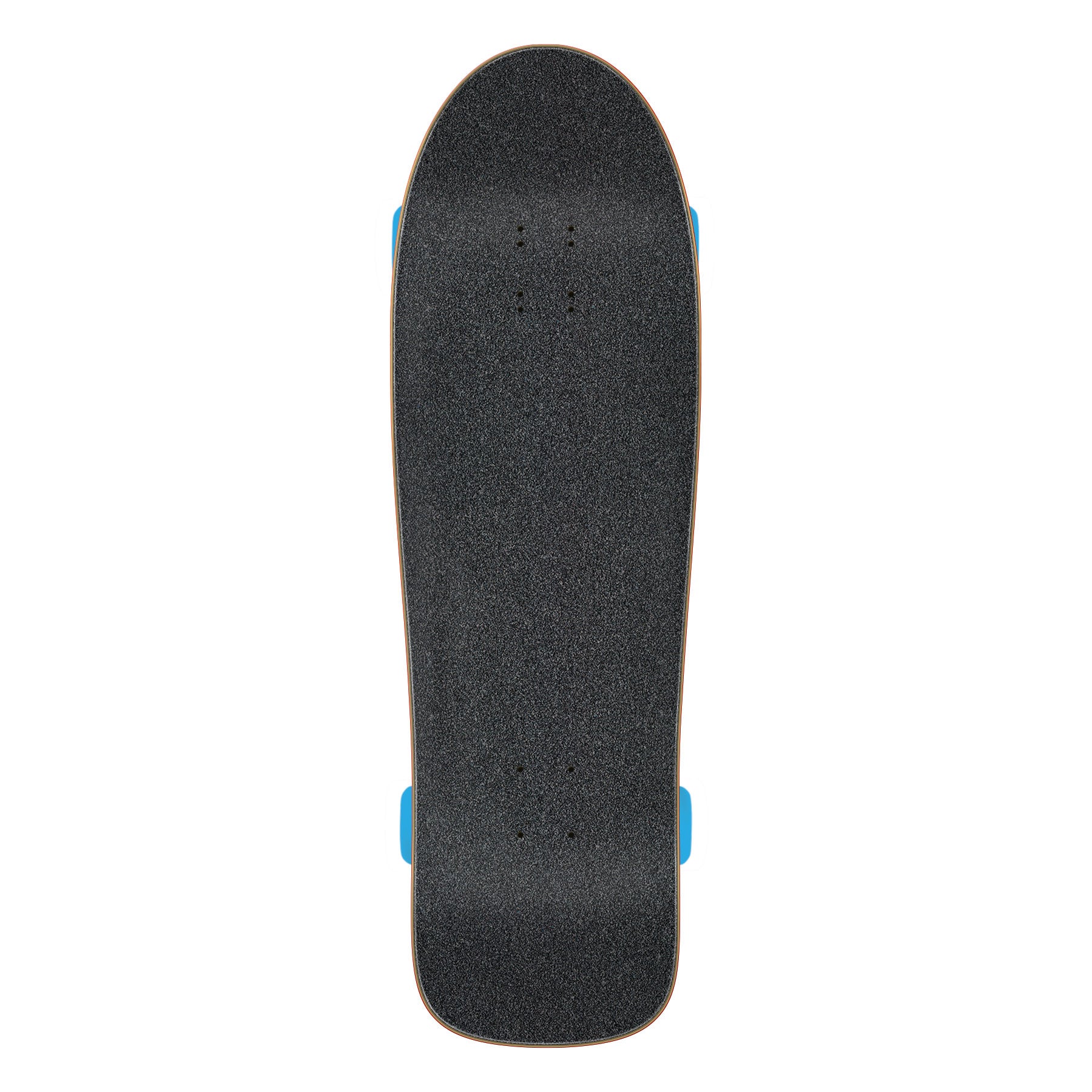 Santa Cruz Skateboards Screaming Flash Cruzer on late 80s styled shaped with adjustable 14.5" to 15" wheelbase, 7 ply North American Maple deck with Krux 9.0 trucks, 58mm 87a OJ Keyframe wheels, and 1/4" riser pads. Measures 9.7" x 31.7".