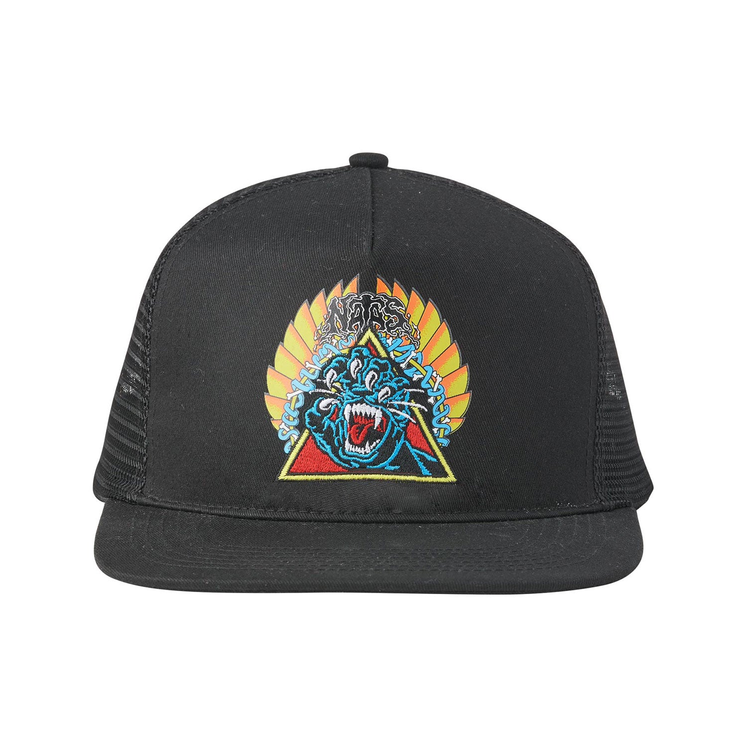 Roll up and stand out in the latest legendary hats and apparel from Santa Cruz Skateboards. The Santa Cruz Natas Panther high profile 5 panel twill faced foam and mesh trucker hat features Natas Screaming Panther screen print, embroidery, and snapback adjuster.