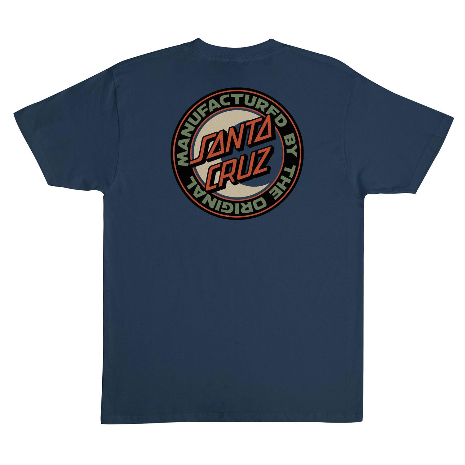 The Santa Cruz MFG Moon Dot men's regular fit short-sleeve t-shirt features small front and large back Santa Cruz MFG Moon Dot artwork printed in soft hand ink.