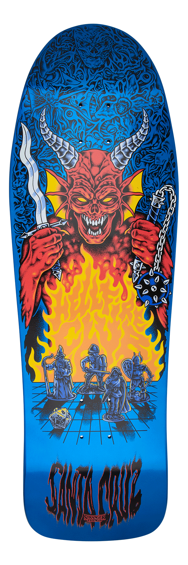 Santa Cruz Skateboards X Stranger Things. The Santa Cruz Stranger Things Knox Hellfire Pit 10.07in x 31.275in deck features Multicolor Glow In The Dark Graphics on Tom Knox's classic Firepit reissue shape. STRANGER THINGS Netflix. Used with permission. Featured Skate Tech: 7 ply North American Maple pressed individually using epoxy - making a strong, responsive deck with long lasting pop and consistent concave and kick. Old School concave is a blast from the past. With a comfortable side to side concave and continuous tail kick OS concave gives you easy foot placement on cruisers, shaped, and old school boards with longer tail than nose.