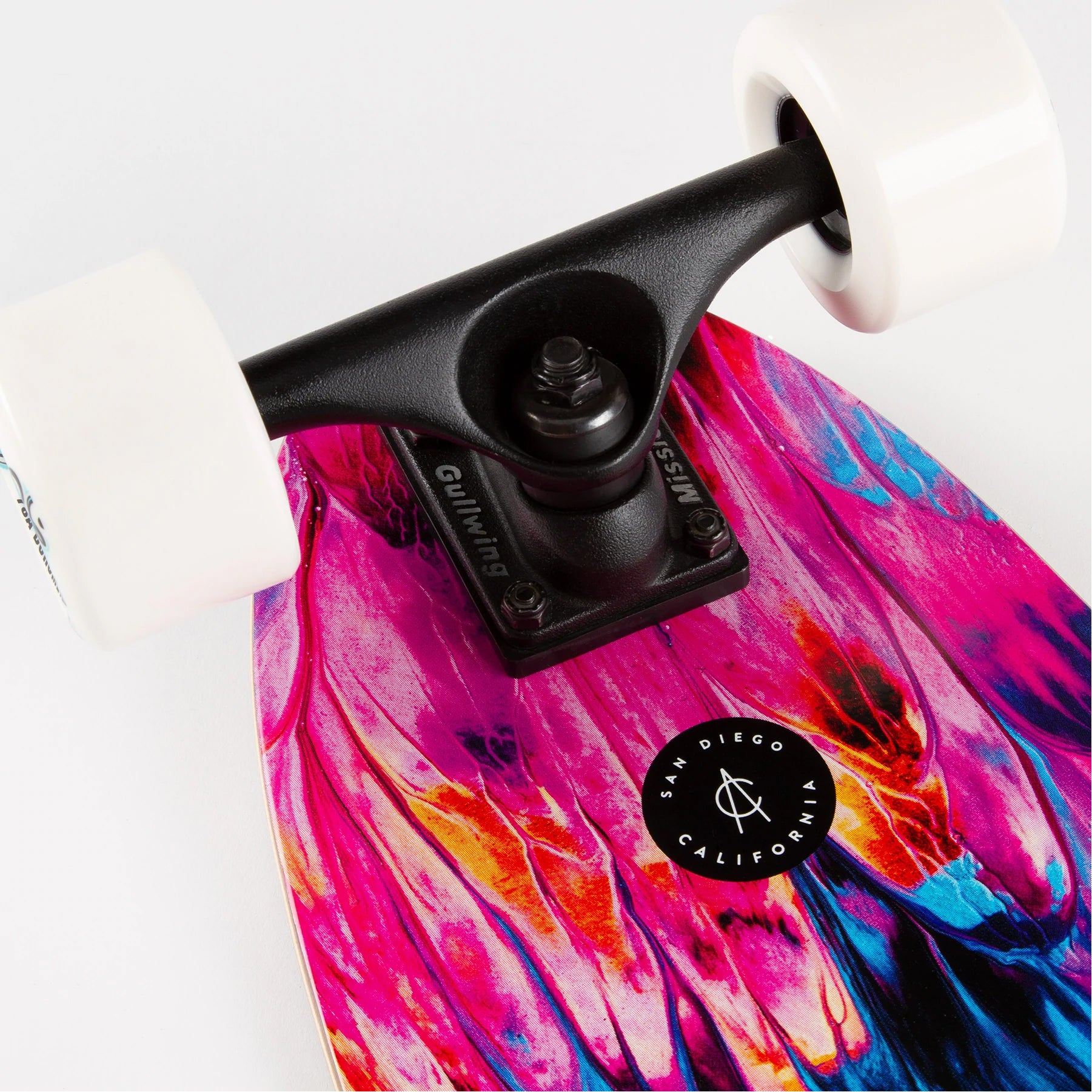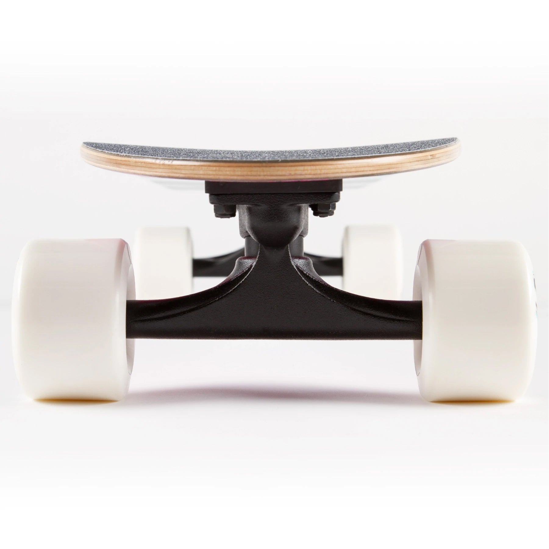 The Splash Snapback is a bouncy fiberglass cruiser that is fun to cruise and carve. RIDING STYLE: Cruising, Carving. DIMENSIONS: Length: 30.0", Width: 8.0", Wheelbase: 20.625". COMPONENTS: 8.375" Gullwing Mission Trucks, 70mm 78a Nineballs, ABEC 5 Greaseball Bearings, 0.25" Recycled Plastic Risers, 1.25" Hardened Steel Bolts, ERG Grip Tape. FEATURES: Fiberglass Maple Sandwich, Camber Mold, Flat Matte Bottom Artwork, Slight Kicktail.