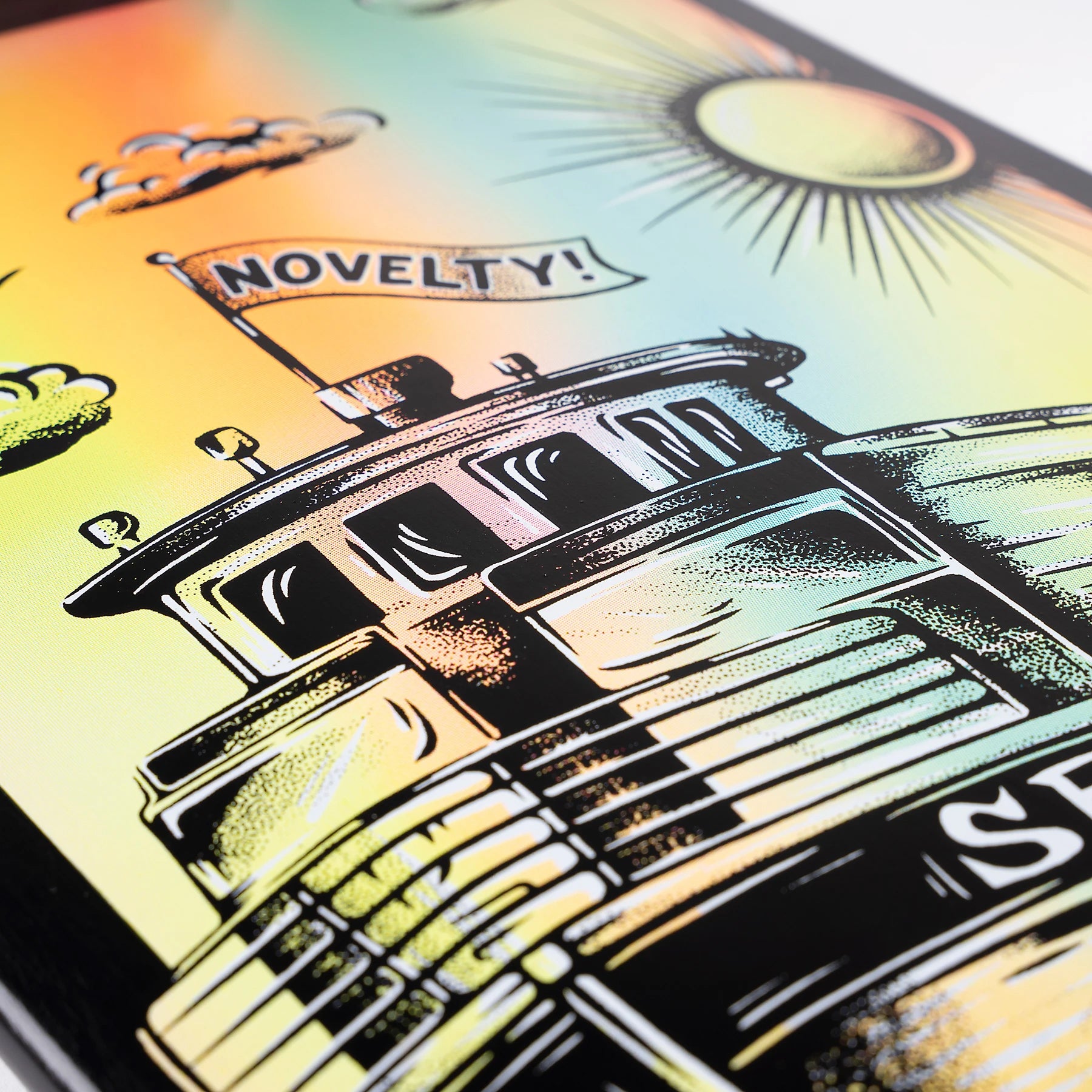 It's all positive vibes on these colorful rides. The Signature Collection is back with new graphics for Ben Gravy. RIDING STYLE: Park, Cruiser. DIMENSIONS: Length: 31.5", Width: 8.8", Wheelbase: 14.25". COMPONENTS: 8.5" Gullwing Shadow Trucks, 61mm 78a Nineballs, ABEC 5 Greaseball Bearings, 0.25" Recycled Plastic Risers, 1.25" Hardened Steel Bolts, Regular Grip Tape. FEATURES: 7 Ply Maple, Full Dip Black Deck, Neon Ink Bottom Art, Printed Grip Tape, Double Kick, Art by Daniel Sheridan.