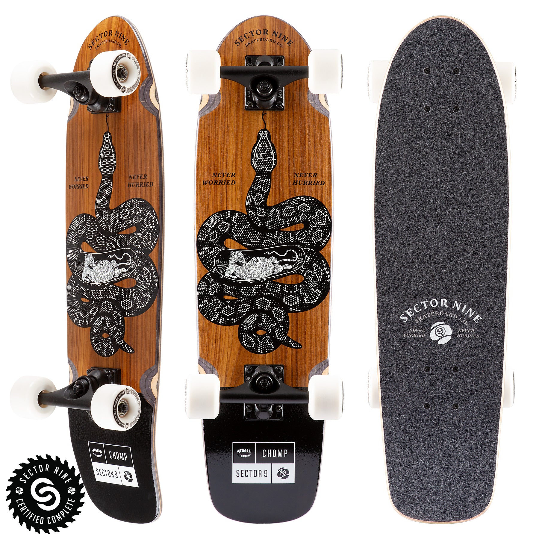 Cruiser Complete from Sector 9. 7 Ply Maple, Teak Wood Bottom Veneer, Raised Pattern Underprint, Kicktail, Collaboration with Chomp Brand. Measures 7.875" x 28.5" with a 14.75" Wheelbase. Comes built with 8.375” Gullwing Mission Trucks, 61mm 78a Nineballs, ABEC 5 Greaseball Bearings, 0.25” Recycled Plastic Risers, 1.25” Hardened Steel Bolts, ERG Grip.