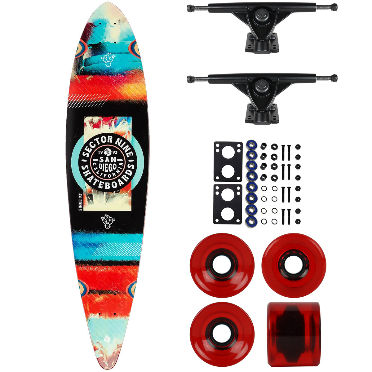 This Pintail style Sector 9 longboard is great for carving and commuting. This board measures 9.25" x 40" with a 27.75" wheelbase. The board comes black griptape. Constructed with 7-Ply Maple and Super Sap environmentally friendly resin. Raised texture print graphic. COMPONENTS: Havoc 181mm Reverse Kingpin Trucks, 65mm 78A USA Made Wheels, Abec 7 Bearings, all neccesary hardware for completion. This package comes with all parts to assemble your longboard. Arrives un-assembled which allows for customization and a feeling of accomplishment. Skaters love building their boards! Easy to assemble!