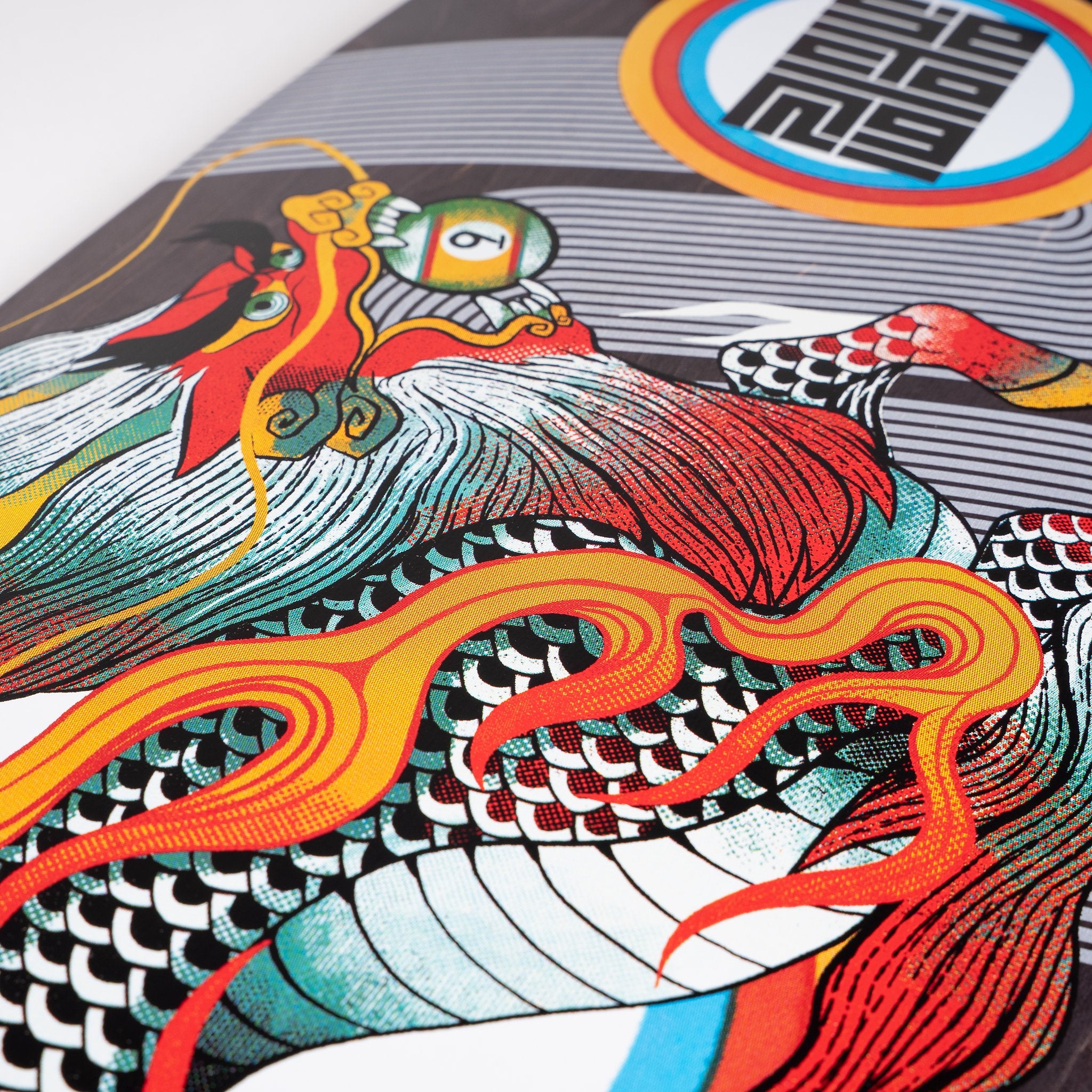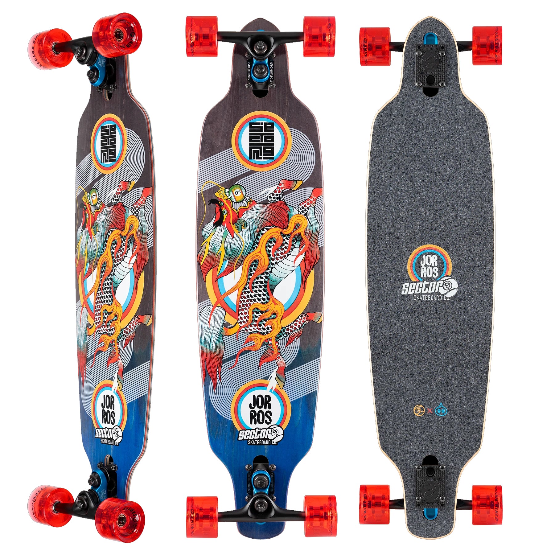 Jor Ros grew up moving back and forth between Mexico and the U.S. and would spend his free time making up characters and creating fictional universes though his drawings. Today, the Barcelona-based artist has developed a portfolio of digital illustrations that imagine the contemporary urban samurai warrior, borrowing the motifs and aesthetic hallmarks of traditional Japanese folklore and American cartoons through a warm, eye grabbing palette. We’re stoked to introduce Jor as our latest featured Artist, and bring some unique Far East style to Sector 9’s West Coast craftsmanship. RIDING STYLE: Carving +. DIMENSIONS: Length: 36.0", Width: 9.0", Wheelbase: 23.6". COMPONENTS: 9.0" Gullwing Sidewinder II Trucks, 69mm 78a Nineballs, ABEC 5 Greaseball Bearings, 1.125" Truss Head Steel Bolts, Regular Grip Tape. FEATURES: 7 Ply Maple, Two-Color Dipped Maple Bottom Ply, Printed Grip Tape, Drop Thru, Art by Jor Ros.