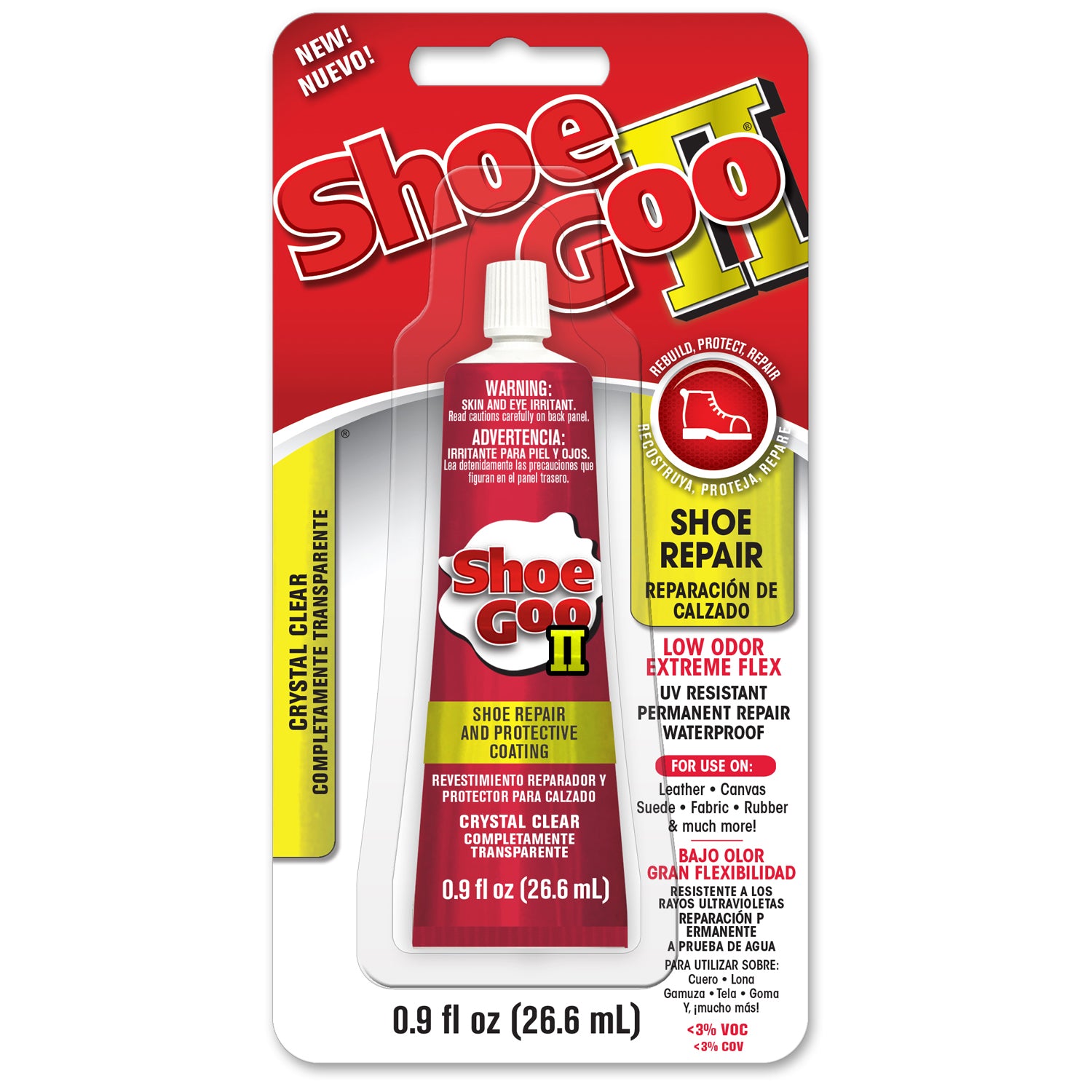 Shoe Goo II, formulated using a premium polymer technology, offers virtually the same performance characteristics you love with Original Shoe Goo, now with low odor! It is crystal clear and offers superb UV and water resistance. Permanently repair/protect all types of footwear! Features: Excellent adhesion to: leather, canvas, suede, rubber, fabric & many other substrates! Solvent-free. Less than 3% VOCs. Dries crystal clear. UV resistant. Extreme flexibility. Permanent bond. Excellent water resistance. Abrasion resistant.