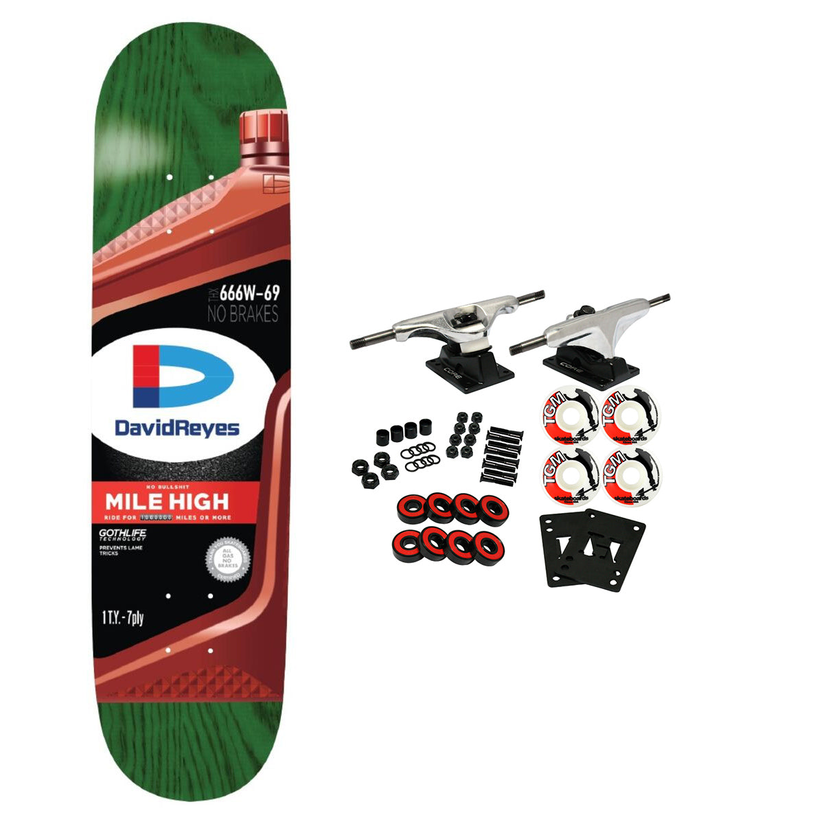 This deck comes in assorted stained background colors. 7-Ply Premium North American Maple Skateboard Deck from Thank You Skateboards. Comes with Core trucks, 52mm TGM logo wheels, Amp abec 5 bearings, Black Diamond Griptape, risers, and hardware. Core trucks are light weight and feature heavy duty aluminum with grade 8 steel kingpins and axles, as well as USA made bushings and pivot cups. 52mm 99A are the perfect wheels for both street and park skating. Like the name states, Amp bearings are stimulants for your wheels! Light synthetic oil, Delrin Crowns, and Rubber Serviceable Shields are a few of the things that makes these bearings one of the best Abec 5 rated bearings on the market. Arrives un-assembled which allows for customization and a feeling of accomplishment. Skaters love building their boards! Easy to assemble!